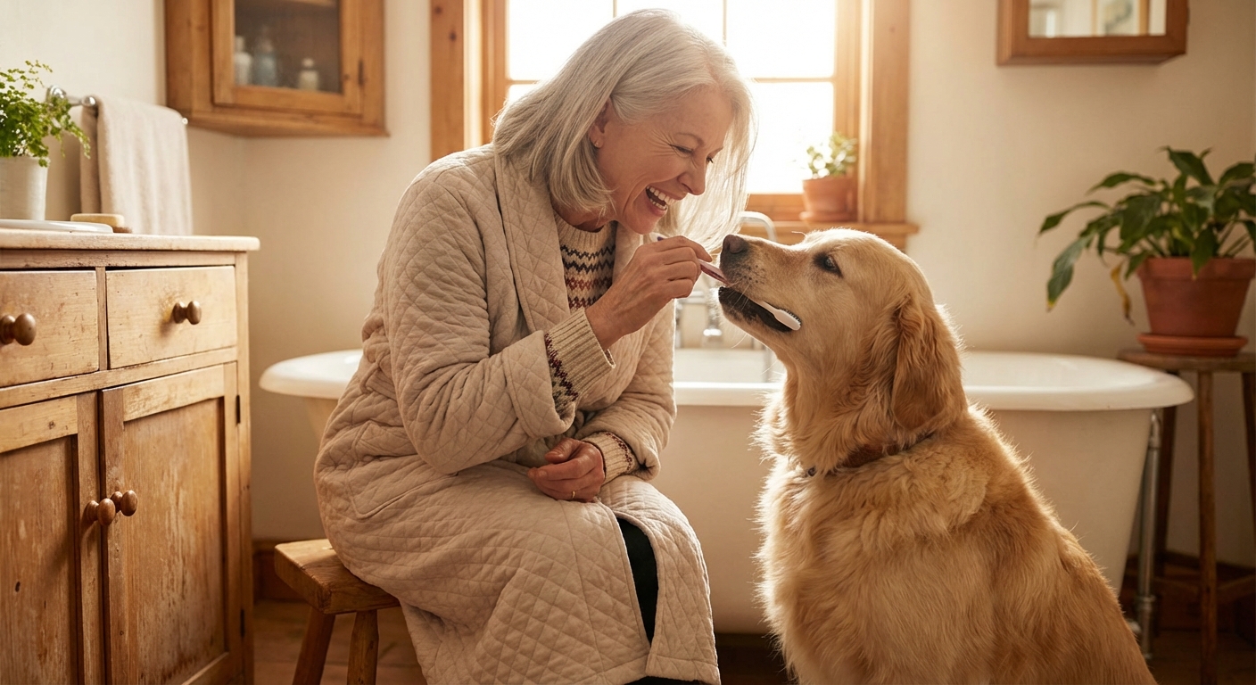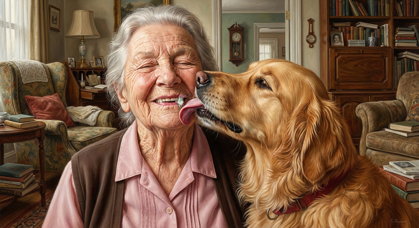 @나노바나나 강아지가 혀로 할머니 입 속을 양치해주는 그림을 사실적인 그림체로 그려주렴
