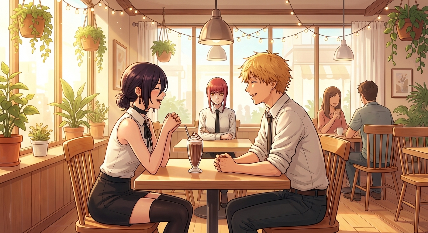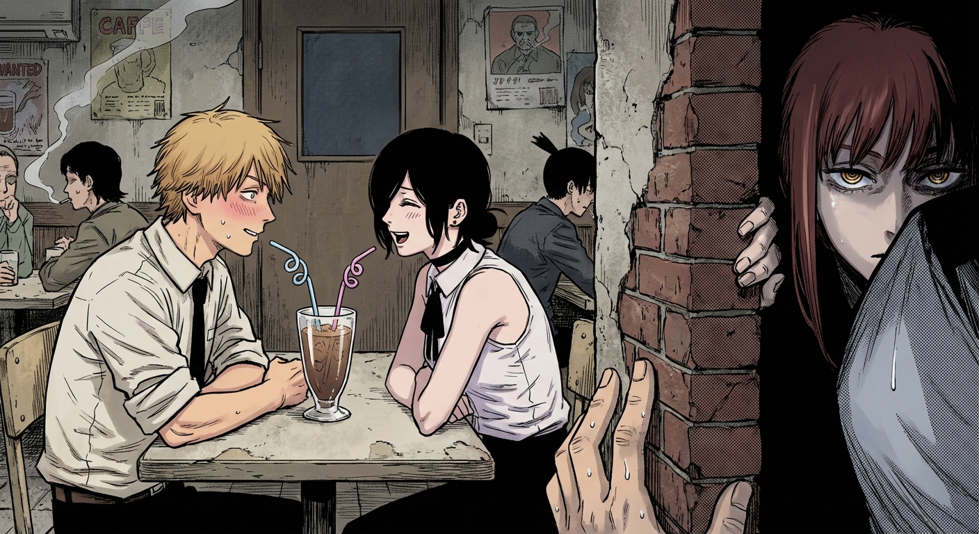 @나노바나나 체인소맨 덴지와 레제가 카페에서 커플빨대로 음료수 먹고 있고 조금 떨어진 벽뒤에 숨은 마키마가 노려보고 있는 그림 그려줘