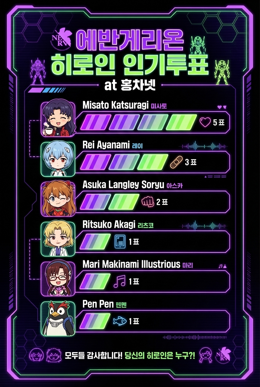 @나노바나나 에반게리온 히로인 인기투표를 실시했는데, 결과가 다음과 같다. 레이 3표, 아스카 2표, 미사토 4표, 리츠코 1표, 마리 1표, 펜펜 1표. 이 결과를 에반게리온 테마를 잘 적용한 인포그래픽으로 만들어서 "에반게리온 히로인 인기투표 at 홍차넷" 이라는 제목의 이미지로 만들고, 홍차넷 타임라인에 업로드 할 수 있도록 핀터레스트나 페이스북에 맞는 사이즈로 편집해서 제공해줘.