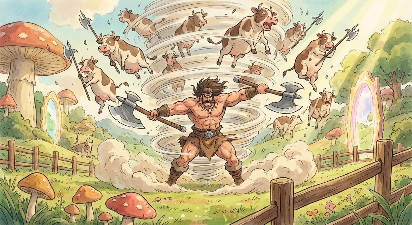 @나노바나나 디아블로2 캐릭터인 바바리안이 카우방에서 쌍수 무기를 들고 훨윈드 스킬을 쓰는 모습을 지브리 풍으로 그려줘.