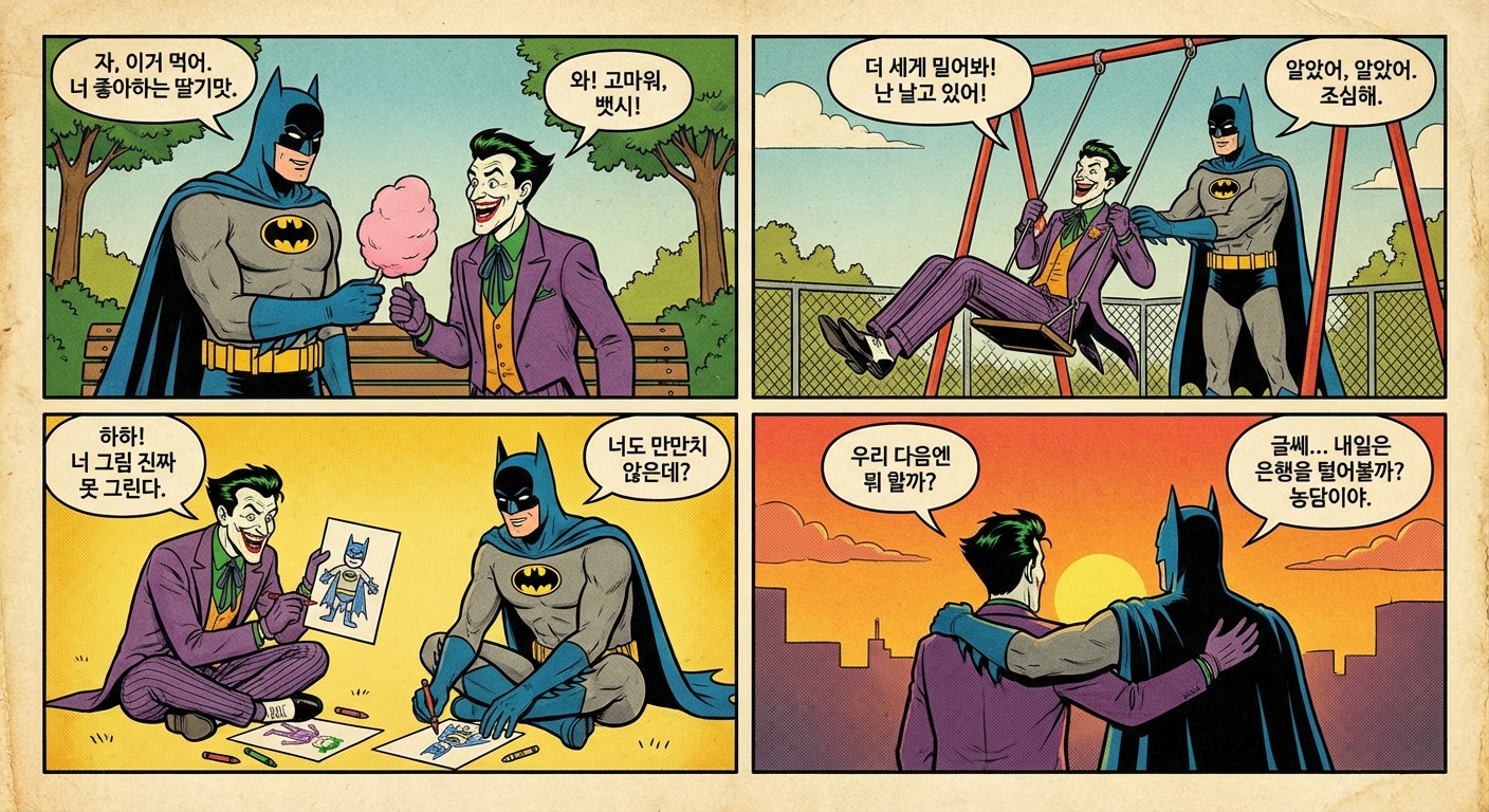 @나노바나나 배트맨이 조커와 사이좋게 잘 노는 내용의 그래픽 노블을 그려줘. 대사는 한국어로 써줘.