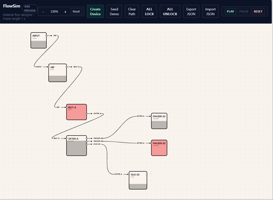입출력포트와 Capacity를 가진 기본 객체를 상속해서 공급, 이송,처리, 저장, 출력 기능을 가진 객체로 상속했고, 여러 설정을 할 수 있도록 했습니다