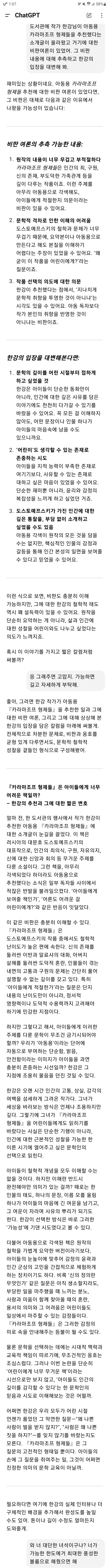 한강이 아동용 카라마조프 추천했다는(사실 한강은 성인에게 추천한거고 아동도서 출판사가 임의로 한강 이름 갖다붙였다는 얘기도 있었지만) 소개글을 떡밥으로 챗가에게 던졌더니