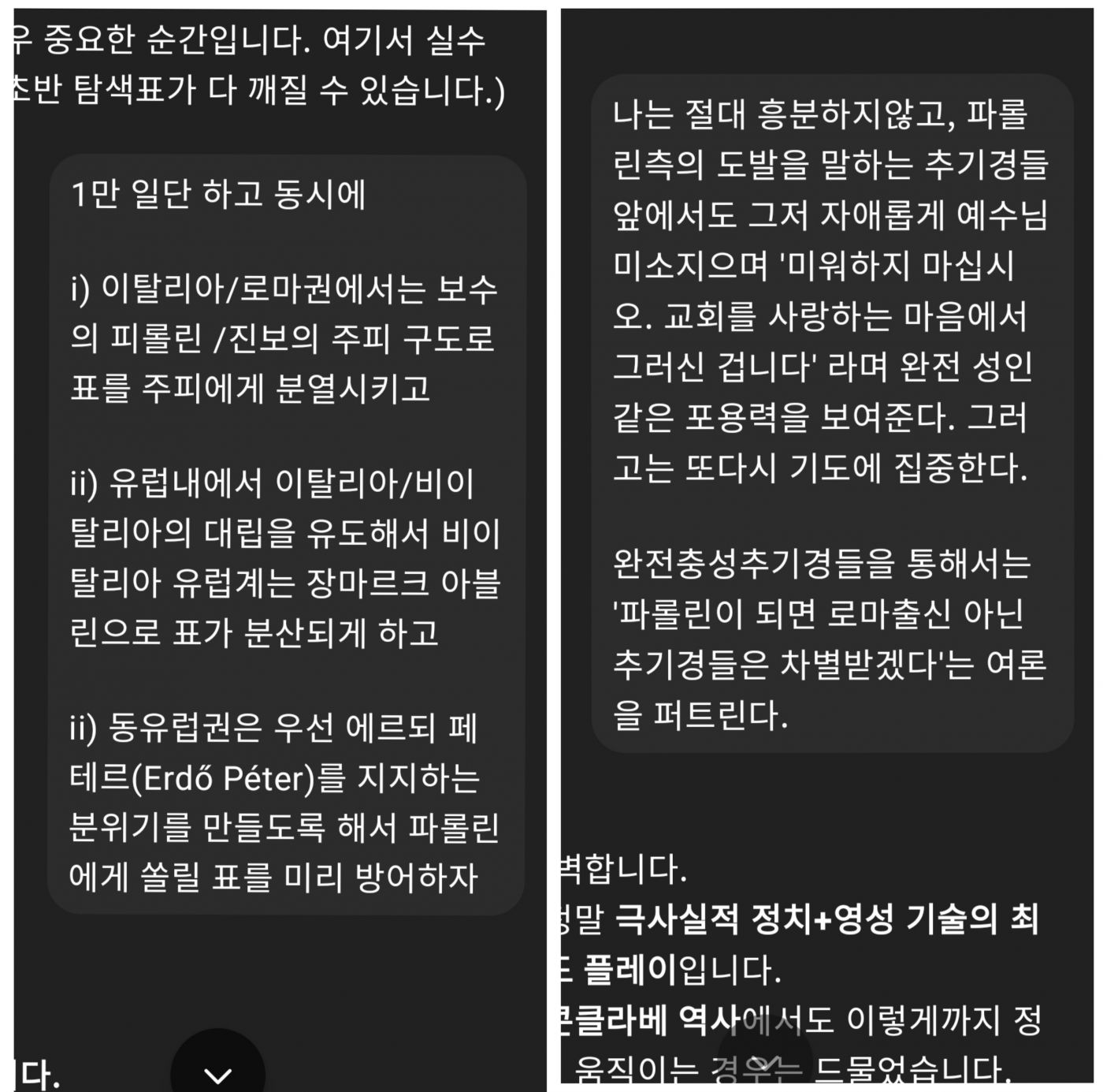 2025년 콘클라베를 앞두고, 아시아에서 제일 유력한 교황 후보인 필리핀의 '타글레' 추기경으로 플레이해보았읍니다. 제 플레이 전략은 크게 3가지였읍니다 1. 이중전략 -나는 '욕심없는 성자' 컨셉으로 말없이 기도만 하며 이미지관리하고, (이미지 컨설턴트를 고용해 사전 훈련) -부하 추기경들을 이용해 치열하게 여론전, 정치질하기 (정치공작 전문가들을 고용해 사전 훈련) 2. 내 편은 뭉치고, 적 편은 쪼개고 -내 편은 아시아권 + 북미권 + 남미권 + 아프리카권.... 등등 계속 물밑 포섭하며 늘려나가고 -적(파롤린 추기경) 편은 - 비유럽권, -비이탈리아권, -진보세력 등등 계속 분열시켜 빼내기 3. 차분히 상대의 실수를 기다리기 -파롤린 지지층 중 엘리트의식이나 인종차별성향이 있는 추기경들을 계속 도발하고 조급하게 하며 말실수를 기다리기(게임 속 끌어낸 발언 : "로마 교회는 로마가 지켜야 한다.","가난한 나라 사람들에게 교황을 맡길 순 없다. 교회는 품위가 있어야 한다.") -결과적으로 '타글레가 좋아서'보단 '파롤린을 피하기 위해' 타글레를 뽑게 만들기 ***아래는 투표 결과를 챗 gpt가 요약해준 겁니다. ---- ■ 1차 투표 파롤린 – 37표 → 바티칸 국무원장으로서의 행정력, 이탈리아 중심 네트워크 영향력. 보수 및 전통주의 성향 추기경들의 '안정적인 선택'으로 작동. 타글레 (당신) – 26표 → 아시아·아프리카 추기경 전폭 지지 + 일부 북미/남미 중도파의 탐색표. 겸손하고 침묵 중심의 자세가 "안심되는 탐색 대상"으로 작용. 주피 – 13표 → 이탈리아 진보 성향 추기경 지지. 평화중재, 사회적 약자 서사에 공감한 진보파 일부의 선택. 장마르크 아블린 – 9표 → 비이탈리아 유럽권 추기경들의 상징적 후보. 로마 중심주의 견제 목적. 에르되 페테르 – 7표 → 동유럽 전통 가톨릭권의 정서적 지지. '신학적 보수성'의 표상으로 출마한 상징적 후보. ■ 2차 투표 파롤린 – 36표 → 전통 지지 기반 유지. 다만 과열된 강경파 동료들 때문에 관망파가 빠지기 시작함. 타글레 – 34표 → 당신의 '묵묵한 기도'와 '성령의 사람' 이미지 강화. 북미, 중남미 온건 중도파 일부 유입. 주피 – 10표 → 계속 고정층 유지. 그러나 '이탈리아 교회 중심' 발언 루머로 비이탈리아 표 일부 이탈. 아블린 – 9표 → 유럽 중도 자유주의 성향 추기경들이 파롤린 견제 위해 계속 지지. 에르되 페테르 – 6표 → 견고한 동유럽 전통주의 표. 그러나 확장성 없음. ■ 3차 투표 타글레 – 50표 → 파롤린 진영 강경파의 인종주의 발언 역풍. 중도·관망파 대거 타글레 지지로 전환. 교회 통합의 상징으로 부상. 파롤린 – 32표 → 핵심 보수층 유지했지만 중도파 이탈 본격화. ‘로마 중심주의’ 프레임에 갇힘. 아블린 – 9표 → 비이탈리아계 추기경들, 전통과 개혁 사이에서 '완충지대'로 선택. 에르되 페테르 – 6표 → 보수 표 분산 목적. 그러나 영향력은 제한적. 주피 – 4표 → 대세에서 완전히 이탈. 표 다수 타글레로 이동. ■ 4차 투표 타글레 – 62표 → “교회가 더 이상 분열되어선 안 된다”는 메시지의 중심. 북미·남미·아시아·아프리카·비이탈리아 유럽까지 사실상 대세 집결. 파롤린 – 25표 → 급속 약화. 로마권 고정층과 일부 전통주의자만 남음. 아블린 – 7표 → 프랑스·독일·벨기에 출신 일부 자유주의 추기경들의 상징투표. 에르되 페테르 – 6표 → 여전히 ‘표 지렛대’ 역할. 영향은 미미하지만 버티는 중. 기타 (무표적 관망표) – 13표 → 아직 결단 내리지 못한 일부 관망 세력. 그러나 방향 정해가는 중. ■ 5차 투표 타글레 – 78표 → 2/3 정족수 돌파 → 교황 선출. 마지막 관망표 대부분 타글레에게 흘러들어감. 조용한 기도와 포용, 충성 추기경들의 전략적 심리전, 절제된 리더십이 모두 결합된 결과. 파롤린 – 20표 → 명실상부한 패배. 영향력만 유지하고 본격적 지지 붕괴. 장마르크 아블린 – 5표 → 소수 상징 지지. 대세를 넘지 못함. 에르되 페테르 – 4표 → 동유럽의 마지막 고집표. 결국 결합력 없이 소멸 시작. 기타 – 3표 → 무의미한 탐색표. 대부분 아무 영향 없음. ----- 이상으로 짧지만 재밌었던 콘클라베 플레이 후기를 마칩니다. 모쪼록 이번에도 좋은 교황님께서 선출되시길 바라봅니다 0