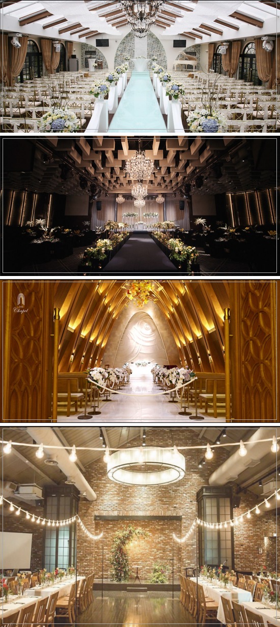교회 혹은 성당의 형태를 띈 예식장입니다. 요새 상당히 핫한 논현의 모 예식장(참고로 이곳 칠리새우 GOAT)을 필두로 꽤나 늘어나는 추세입니다. 다만, 예식장 크기가 대부분 협소하고(저도 하객으로 가서 앉아본 기억이 별로 없네요) 특정 종교의 느낌이 좀 나서 부모님들 세대에서 꺼리는 사례도 가끔 있읍니다.
