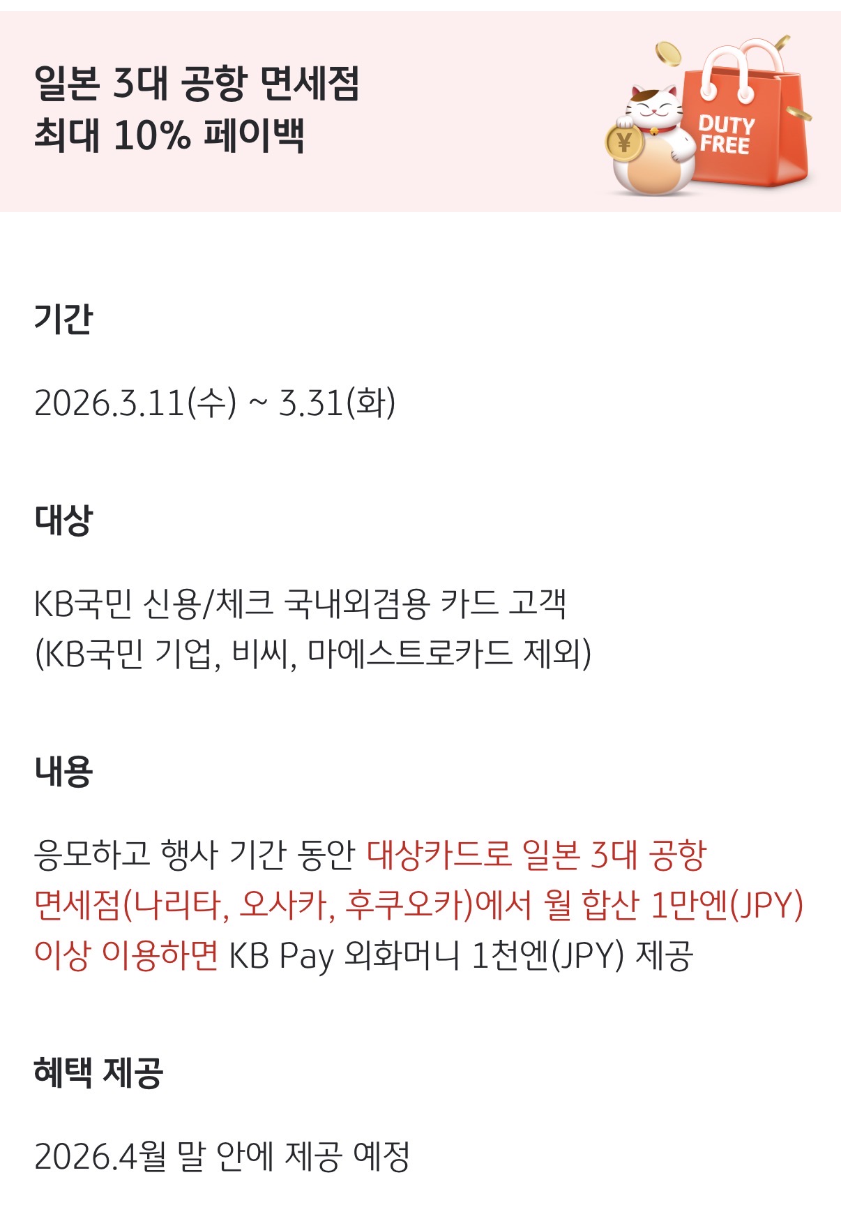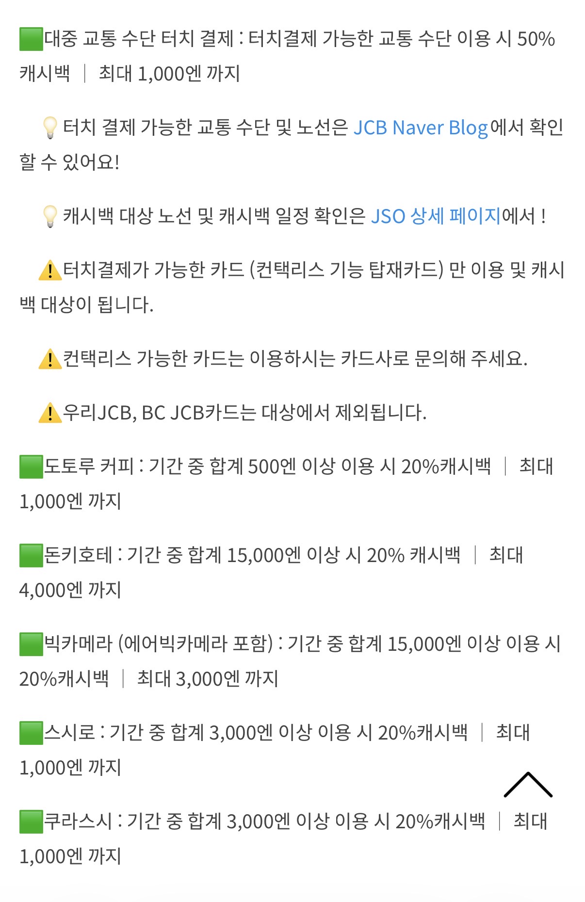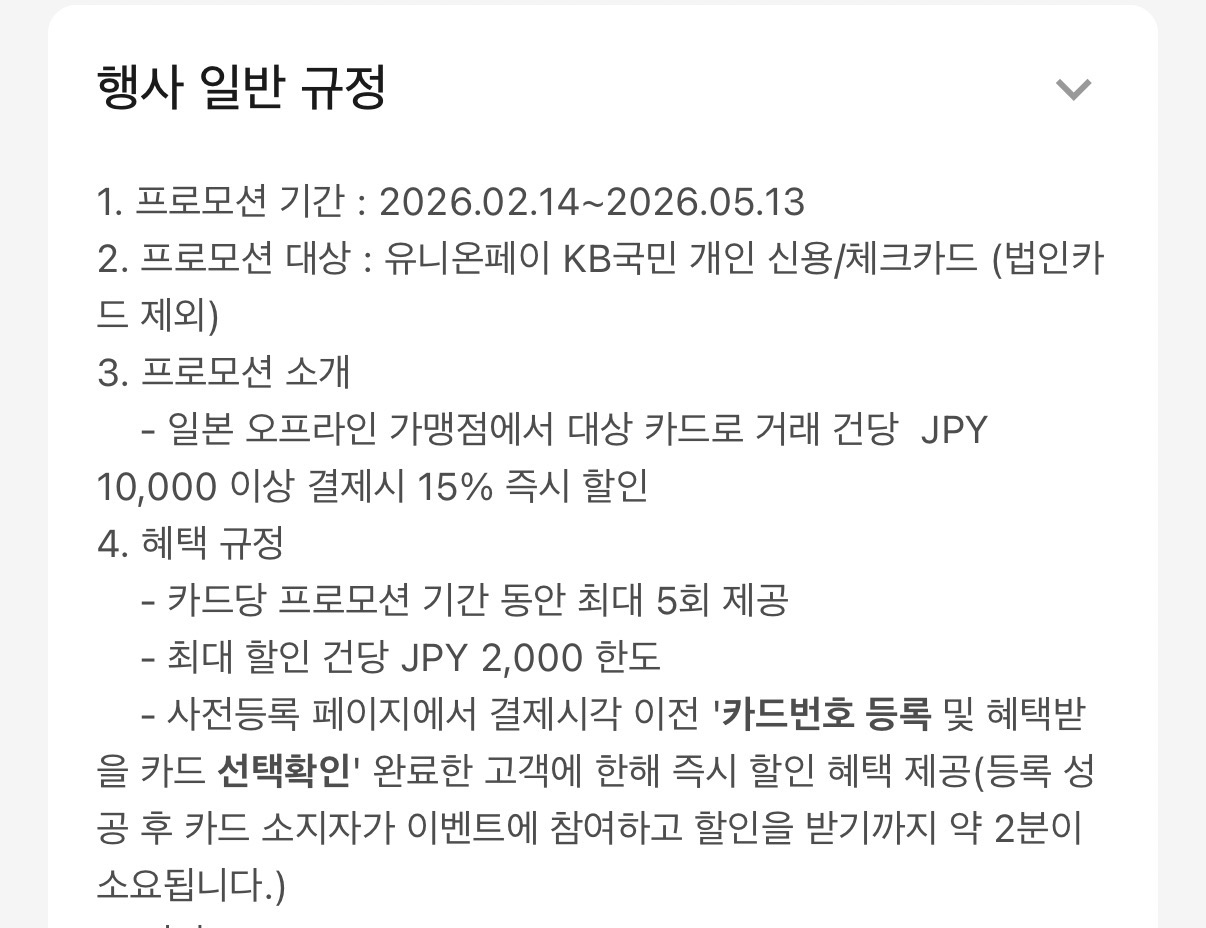 원래 작년 가을 일본여행때 쓰려고 했는데 귀찮아서 못적었습니다. 어디 댓글엔 조금 쓰긴했던것 같은데…. 정리하면서 혹시 다른 팁도 서로 공유하고 저도 제대로 준비가 된건지 확인하려는 의미에서 일본여행 카드 할인 내용 정리해봤습니다. 1. 유니온페이 유니온페이 같은 경우는 언젠가부터 사장님이 미쳤어요 수준의 할인을 해주고 있습니다. 도대체 왜이러는거죠? 라는 소리가 나올정도로요. 단하나의 문제는 일본에서 유니온페이를 받는 가맹점이 극히 적습니다. 또한 유니온페이가 된다고 해도 결제가 단말기에서 유니온페이를 찍고 들어가야 해서 결제를 잘 못하는 경우도 있습니다. 이점을 미리 사전에 인지해주시면 좋을 것 같습니다. 경험상 대형매장(빅카메라), 큰체인점(유니클로), 공항 면세점 등에서 쓰는게 좋습니다. 일단 유니온페이 카드는 체크카드로 발급하시는게 좋은데 유니온페이 체크카드수 자체가 워낙 적어서 나무위키에 잘 정리가 되어있습니다. https://namu.wiki/w/UnionPay 유니온페이 혜택 페이지를 참고하시면 적용중인 행사를 확인하실수 있는데요. 이벤트마다 국가가 다르니 세부 페이지를 다 확인 하셔야 합니다. https://marketing.unionpayintl.com/offer-promote/?language=kr&insCode=299990156&countryCode=410&province=0#/ 개인적으로 괜찮아 보이는 행사는 ![]() 하나카드 - 50달러 이상시 10달러 할인 3회적용 국민카드 - 10000엔 이상시 15프로. 2000엔까지 할인 5회 적용 농협카드 - 10%할인 할인총액10만원(카드사용액100만원)까지 1일3회 총 10회 적용 입니다. 이외에도 우리,ibk,삼성 다 별도 행사 있고 행사는 계속 업데이트 되니 잘만 쓰시면 최소 10%이상 할인은 받으실수 있습니다. ![]() 예산이 끝나면 할인을 못받는데요. 각각 행사마다 잔여예산도 확인하실수 있으니 결제 전에 확인하시는게 중요합니다. 그리고 유니온페이 같은 경우는 결제 하면 바로 할인내용이 문자로 옵니다. 그래서 바로 확인이 가능한것도 장점. 2. JCB 카드(추천이긴 한데 행사기간 확인 필요) JCB카드가 사실 제일 꿀이긴 한데 이게 주요행사가 3월말 종료라 이제와서 추천드리긴 좀 너무 늦은감이 있긴 합니다. 3월말까지 하는 주요 행사는 ![]() 빅카메라 20%, 돈키호테 20% 등 입니다. 이게 정말좋은게 할인한도가 카드당으로 들어 갑니다. 빅카메라에서 2만엔정도 하는 양주 3병 사신다면 JCB 3장 들고 가시면 됩니다. 그럼 계산당 4천엔 할인이 됩니다. 본인카드만 만들고 가족카드도 행사에 해당이 되어서 가족카드를 여러장 만드는 방법도 있습니다. 이게 좋은게 가격비교를 안해도 됩니다. 다른데보다 돈키호테가 가격이 비싸도 5%쿠폰 + 10% 면세 + 20% 할인을 때려버리면(그리고 아래 이벤트로 10% 추가 할인까지도 가능) 그냥 어지간하면 최저가 이하 입니다. 빅카메라도 마찬가지구요. 그리고 4월말까지 일본여행 계획이 있으시다면 ![]() 10만엔 쓰시면 만엔 돌려줍니다. 유니온페이보다 할인률은 조금 약하지만 JCB카드는 일본에서는 그냥 어디에서나 통용되는 수준이라는 점과 결제건당 최소금액 없이 통합 10만엔만 쓰면 되는게 장점 입니다. 이벤트 링크참조 https://www.specialoffers.jcb/kr/promotion/japancashback202602/ 그리고 JCB는 좋은점중에 하나가 JCB공식블로그에 애매한거 게시글에 질문하면 답변을 잘해줍니다. 애매하면 물어보면 됩니다. 특정지점 할인되나요? 같은거 확인해주기도 합니다. JCB카드 만드실거면 일본여행용으로 신한 HARU카드 만드시는거 추천합니다. 3. 국내카드사 이벤트 활용 여행기간에 맞춰서 국내카드사 이벤트도 적용받으시면 좋습니다. 여행전에 카드사 이벤트 페이지에서 카테고리 해외로 잡으시고 확인해보시는게 좋습니다. 보통 이벤트를 자주하는 카드사는 하나랑 KB인데요. 하나카드는 트래블로그 카드 위주로 재미있는 행사를 자주하는데 지금은 특별한게 없네요. 국민카드는 아래와 같은 행사가 있습니다. ![]() 그냥 편의점 1000엔 사면 50% 할인이라고 보시면 됩니다. 회수도 넉넉하게 10번. 가족도 다 카드 만들어서 가면 인원수 만큼 10회씩 늘어나겠네요. 극단적으로는 여행 안가는 사람 카드도 가져가고 싶을만큼 좋아보이는 행사입니다. 작년엔 편의점 1000엔이상 결제시 5천원CU 상품권을 줬는데요. 회수는 마찬가지로 10회였구요. 이번달에는 500엔으로 주네요. ![]() 그리고 이런행사도 좋습니다. 이러면 유니온페이 KB카드로 면세점에서 12000엔 이상 사용하시면 15%할인 + 천엔 환급이 되겠네요. 결론 1. 유니온페이 할인 미쳤다…(일본이외에 국가도 되니 카드사별 세부 이벤트 확인) 2. 4월말까지는 JCB카드 이벤트 괜찮음, 카드당이니 돈많이 쓰실분은 카드 여러장 구비해서 가세요. 3. KB카드 편의점 이벤트는 50%할인이라 개꿀이니 가능한 많이 카드 준비해서 가시면 더욱 좋습니다. 행사 자주하니 여행전 종종 카드사 이벤트 페이지 들어가보세요, 1