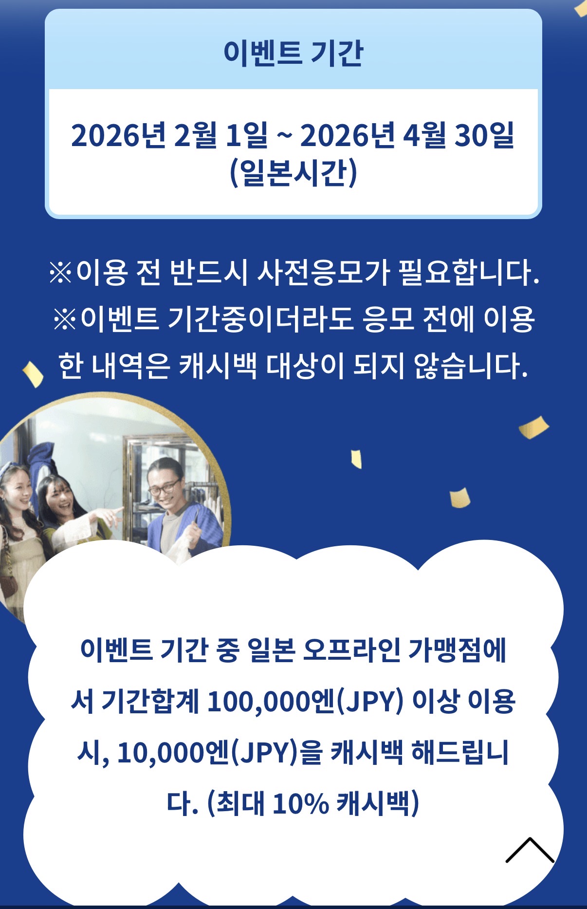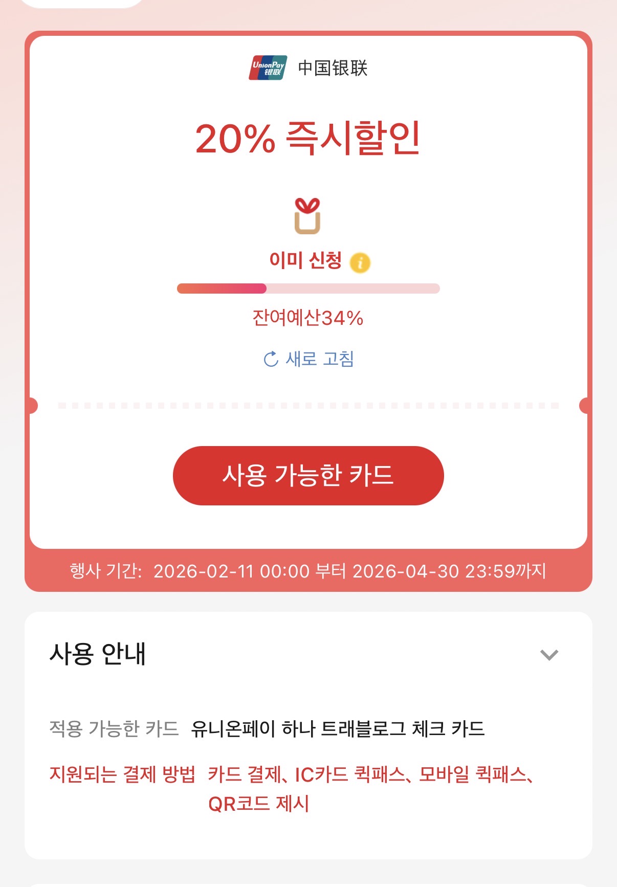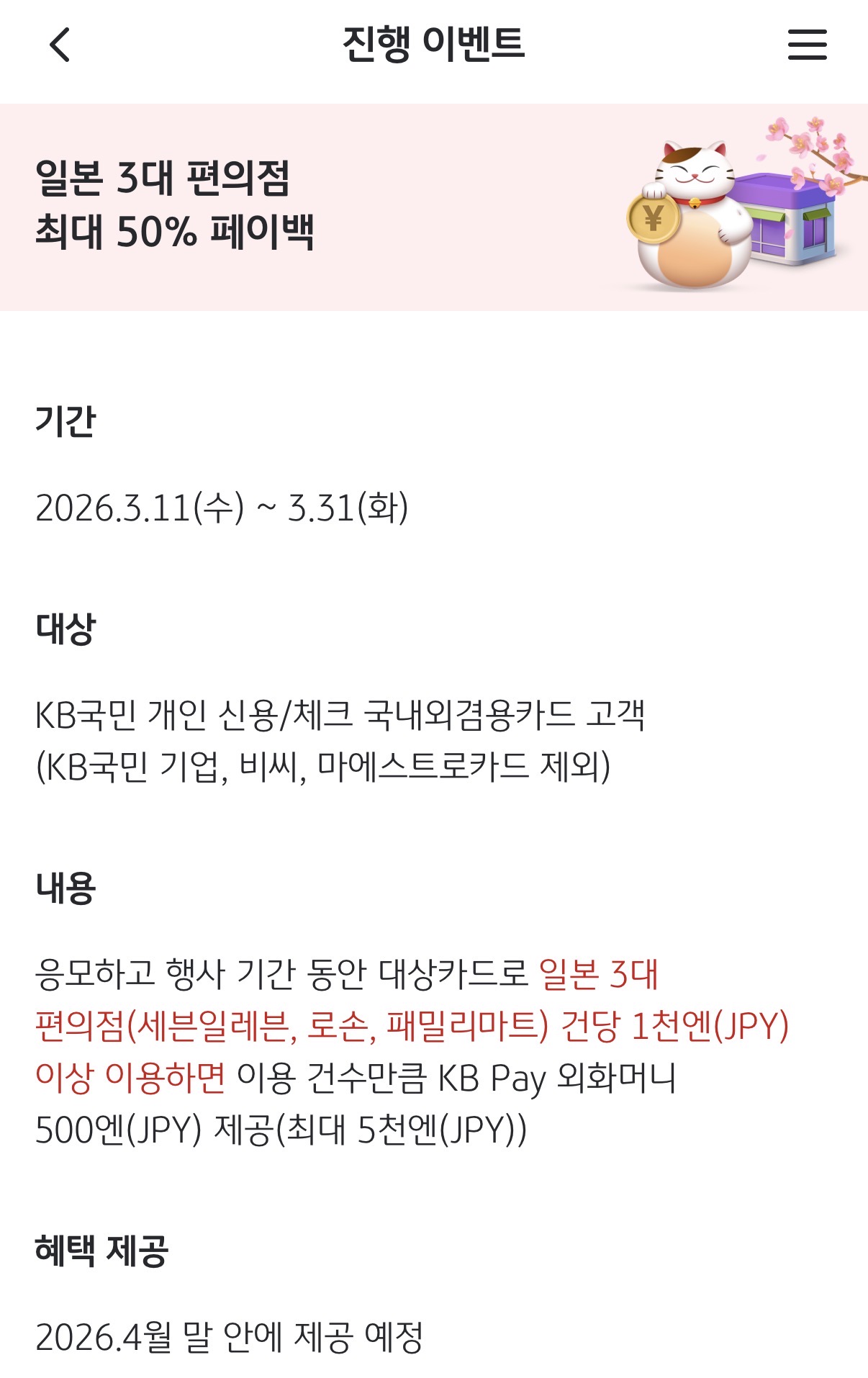 원래 작년 가을 일본여행때 쓰려고 했는데 귀찮아서 못적었습니다. 어디 댓글엔 조금 쓰긴했던것 같은데…. 정리하면서 혹시 다른 팁도 서로 공유하고 저도 제대로 준비가 된건지 확인하려는 의미에서 일본여행 카드 할인 내용 정리해봤습니다. 1. 유니온페이 유니온페이 같은 경우는 언젠가부터 사장님이 미쳤어요 수준의 할인을 해주고 있습니다. 도대체 왜이러는거죠? 라는 소리가 나올정도로요. 단하나의 문제는 일본에서 유니온페이를 받는 가맹점이 극히 적습니다. 또한 유니온페이가 된다고 해도 결제가 단말기에서 유니온페이를 찍고 들어가야 해서 결제를 잘 못하는 경우도 있습니다. 이점을 미리 사전에 인지해주시면 좋을 것 같습니다. 경험상 대형매장(빅카메라), 큰체인점(유니클로), 공항 면세점 등에서 쓰는게 좋습니다. 일단 유니온페이 카드는 체크카드로 발급하시는게 좋은데 유니온페이 체크카드수 자체가 워낙 적어서 나무위키에 잘 정리가 되어있습니다. https://namu.wiki/w/UnionPay 유니온페이 혜택 페이지를 참고하시면 적용중인 행사를 확인하실수 있는데요. 이벤트마다 국가가 다르니 세부 페이지를 다 확인 하셔야 합니다. https://marketing.unionpayintl.com/offer-promote/?language=kr&insCode=299990156&countryCode=410&province=0#/ 개인적으로 괜찮아 보이는 행사는 ![]() 하나카드 - 50달러 이상시 10달러 할인 3회적용 국민카드 - 10000엔 이상시 15프로. 2000엔까지 할인 5회 적용 농협카드 - 10%할인 할인총액10만원(카드사용액100만원)까지 1일3회 총 10회 적용 입니다. 이외에도 우리,ibk,삼성 다 별도 행사 있고 행사는 계속 업데이트 되니 잘만 쓰시면 최소 10%이상 할인은 받으실수 있습니다. ![]() 예산이 끝나면 할인을 못받는데요. 각각 행사마다 잔여예산도 확인하실수 있으니 결제 전에 확인하시는게 중요합니다. 그리고 유니온페이 같은 경우는 결제 하면 바로 할인내용이 문자로 옵니다. 그래서 바로 확인이 가능한것도 장점. 2. JCB 카드(추천이긴 한데 행사기간 확인 필요) JCB카드가 사실 제일 꿀이긴 한데 이게 주요행사가 3월말 종료라 이제와서 추천드리긴 좀 너무 늦은감이 있긴 합니다. 3월말까지 하는 주요 행사는 ![]() 빅카메라 20%, 돈키호테 20% 등 입니다. 이게 정말좋은게 할인한도가 카드당으로 들어 갑니다. 빅카메라에서 2만엔정도 하는 양주 3병 사신다면 JCB 3장 들고 가시면 됩니다. 그럼 계산당 4천엔 할인이 됩니다. 본인카드만 만들고 가족카드도 행사에 해당이 되어서 가족카드를 여러장 만드는 방법도 있습니다. 이게 좋은게 가격비교를 안해도 됩니다. 다른데보다 돈키호테가 가격이 비싸도 5%쿠폰 + 10% 면세 + 20% 할인을 때려버리면(그리고 아래 이벤트로 10% 추가 할인까지도 가능) 그냥 어지간하면 최저가 이하 입니다. 빅카메라도 마찬가지구요. 그리고 4월말까지 일본여행 계획이 있으시다면 ![]() 10만엔 쓰시면 만엔 돌려줍니다. 유니온페이보다 할인률은 조금 약하지만 JCB카드는 일본에서는 그냥 어디에서나 통용되는 수준이라는 점과 결제건당 최소금액 없이 통합 10만엔만 쓰면 되는게 장점 입니다. 이벤트 링크참조 https://www.specialoffers.jcb/kr/promotion/japancashback202602/ 그리고 JCB는 좋은점중에 하나가 JCB공식블로그에 애매한거 게시글에 질문하면 답변을 잘해줍니다. 애매하면 물어보면 됩니다. 특정지점 할인되나요? 같은거 확인해주기도 합니다. JCB카드 만드실거면 일본여행용으로 신한 HARU카드 만드시는거 추천합니다. 3. 국내카드사 이벤트 활용 여행기간에 맞춰서 국내카드사 이벤트도 적용받으시면 좋습니다. 여행전에 카드사 이벤트 페이지에서 카테고리 해외로 잡으시고 확인해보시는게 좋습니다. 보통 이벤트를 자주하는 카드사는 하나랑 KB인데요. 하나카드는 트래블로그 카드 위주로 재미있는 행사를 자주하는데 지금은 특별한게 없네요. 국민카드는 아래와 같은 행사가 있습니다. ![]() 그냥 편의점 1000엔 사면 50% 할인이라고 보시면 됩니다. 회수도 넉넉하게 10번. 가족도 다 카드 만들어서 가면 인원수 만큼 10회씩 늘어나겠네요. 극단적으로는 여행 안가는 사람 카드도 가져가고 싶을만큼 좋아보이는 행사입니다. 작년엔 편의점 1000엔이상 결제시 5천원CU 상품권을 줬는데요. 회수는 마찬가지로 10회였구요. 이번달에는 500엔으로 주네요. ![]() 그리고 이런행사도 좋습니다. 이러면 유니온페이 KB카드로 면세점에서 12000엔 이상 사용하시면 15%할인 + 천엔 환급이 되겠네요. 결론 1. 유니온페이 할인 미쳤다…(일본이외에 국가도 되니 카드사별 세부 이벤트 확인) 2. 4월말까지는 JCB카드 이벤트 괜찮음, 카드당이니 돈많이 쓰실분은 카드 여러장 구비해서 가세요. 3. KB카드 편의점 이벤트는 50%할인이라 개꿀이니 가능한 많이 카드 준비해서 가시면 더욱 좋습니다. 행사 자주하니 여행전 종종 카드사 이벤트 페이지 들어가보세요, 1
