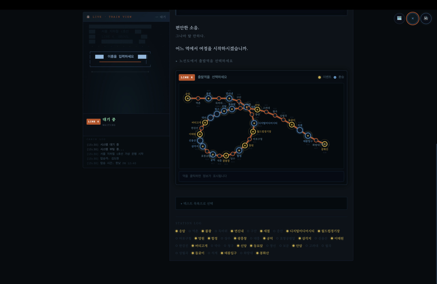 "다음 역은 상월곡, 상월곡역입니다." 원래는 '역명 유래 한자'를 알려주는 교양(?) 기능을 넣으려다... 기왕 생존 게임인 거, 이걸 생존 시스템에 편입시켰습니다.