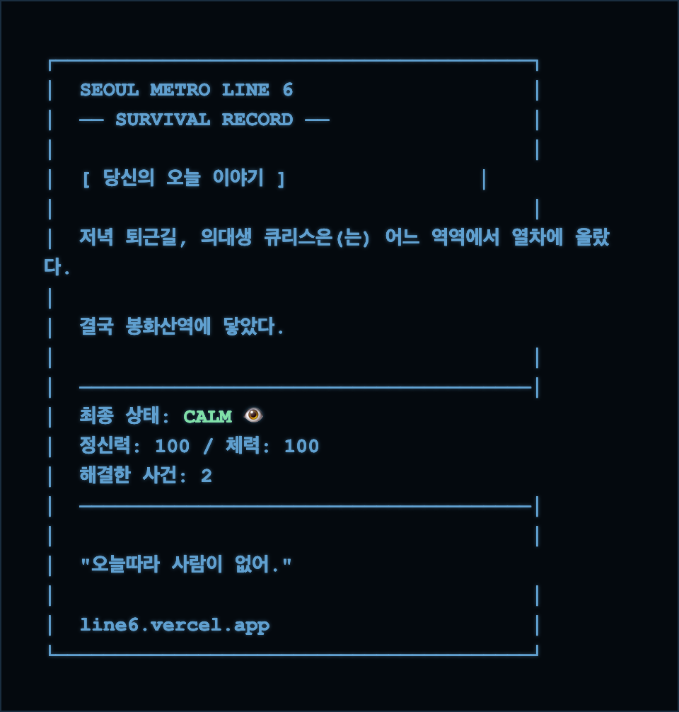 오늘 퇴근길 지하철 안에서, 혹은 자기 전 침대 위에서 여러분의 생존 본능을 시험해 보세요. 버그 제보나 더 무서운 6호선 괴담 아이디어는 언제나 환영입니다!