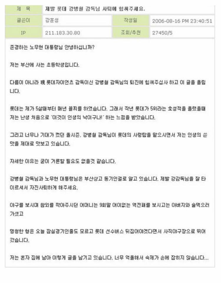 문재인 대통령님, 이대호 선수와 같은 경남고 출신으로 알고 있는데 잘 타이르셔서 병살타 좀 그만 치게 해주세요. 0