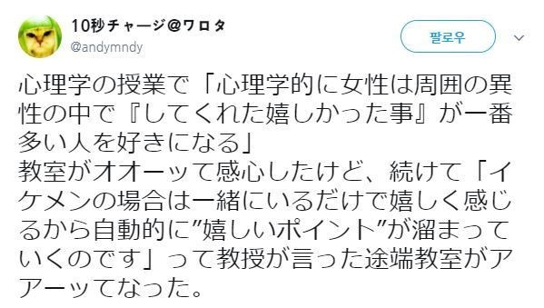 심리학 수업에서 교수 왈 '심리학적으로 여성은 주변 이성중에 "그 사람으로 인해 기뻤던 일"이 가장 많은 사람을 좋아하게 됩니다' 학생들 '오오오' '하지만 미남의 경우 같이 있기만 해도 기쁘다고 느끼므로 자동적으로'기쁨 포인트'가 쌓이게 됩니다' 학생들 '아아아' 그러니까 잘생겨야.. 0