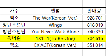 2011년 가온차트가 출범한 이후 기준입니다. 2011년부터 지난 목요일 발표된 2017년 8월까지 역대 앨범 판매량입니다. 탑 100까지 해보고 싶었으나 시간의 압박으로.... 50위까지는 전부 엑소랑 방탄이고 소녀시대, 트와이스, 슈퍼주니어, 동방신기, 갓세븐, 세븐틴 정도가 간간이 끼어 있어서 재미가 없... 여튼간에... 관전포인트는~~ 1. 데뷔앨범으로 70만장 돌파한 워너원 정말 대단해~~ 2. 2001년 이후로 사라진 단일 앨범 100만장을 과연 14년만에 엑소가 만들 것인가!! 3. 18일 발매 예정인 LOVE 앨범 선주문 105만장을 찍은 방탄소년단은 과연 엑소를 제칠수 있을것인가. 4. 역시 남돌이 짱이다. 힘내라!! 여돌+솔로 가수들. ㅜㅜ 0