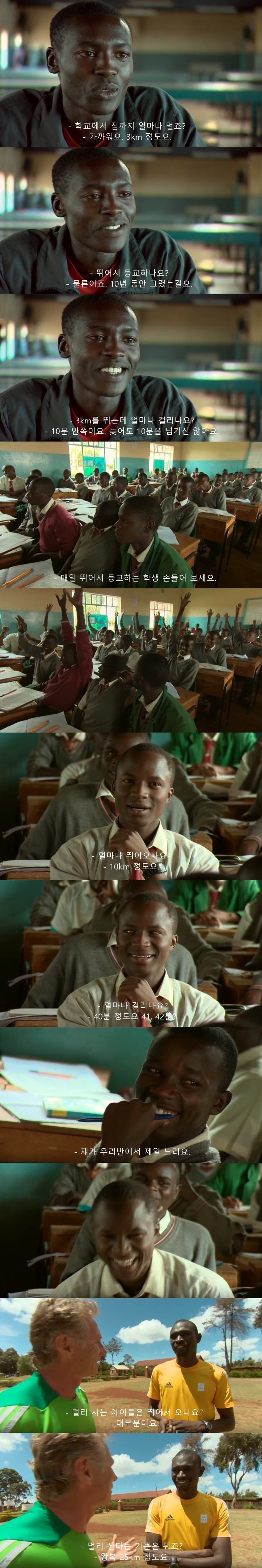 뛰어서.. 3킬로 10분대는 보통이고 10킬로 40분대는 반에서 가장 느린 케냐 학생들. 저 시골 살때 4킬로 정도 걸어서 통학할 때 1시간 정도 걸렸던 기억이 나네요. 왕복 두시간 걸어 통학하고도 기운이 넘쳐 온동네 뛰어 다닌거 생각하면 시골애들이 왜 날씬한지 이해가 됨요. 7시에 일어나 밥먹고 집에서 늦어도 8시 전에 출발해야 학교에 지각하지 않았는데 1년 내내 새벽같이 일어나 밥해주고 빨래해주고 도시락 싸주신 우리 할무니 생각 나네요... 반찬투정해서 죄송해여 할머니... ㅜㅜ 1