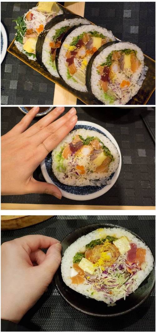 내용물은 새우튀김, 계란, 참치, 연어, 연어알 등등