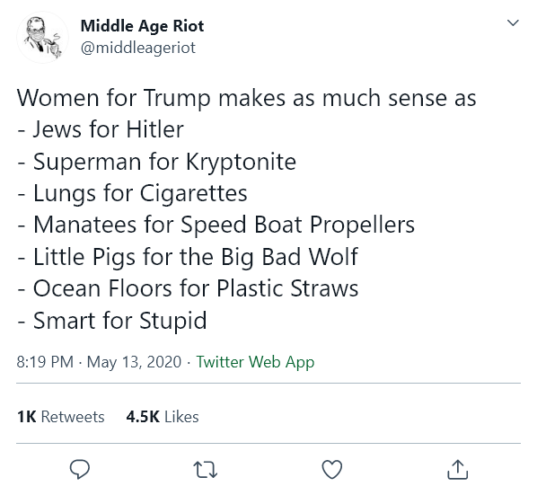 | File #1 | Screenshot_2020_05_13_Middle_Age_Riot_on_Twitter_Women_for_Trump_makes_as_much_sense_as___Jews_for_Hitler___Superman_for_Kr[...].png (31.3 KB), Download : 109 |