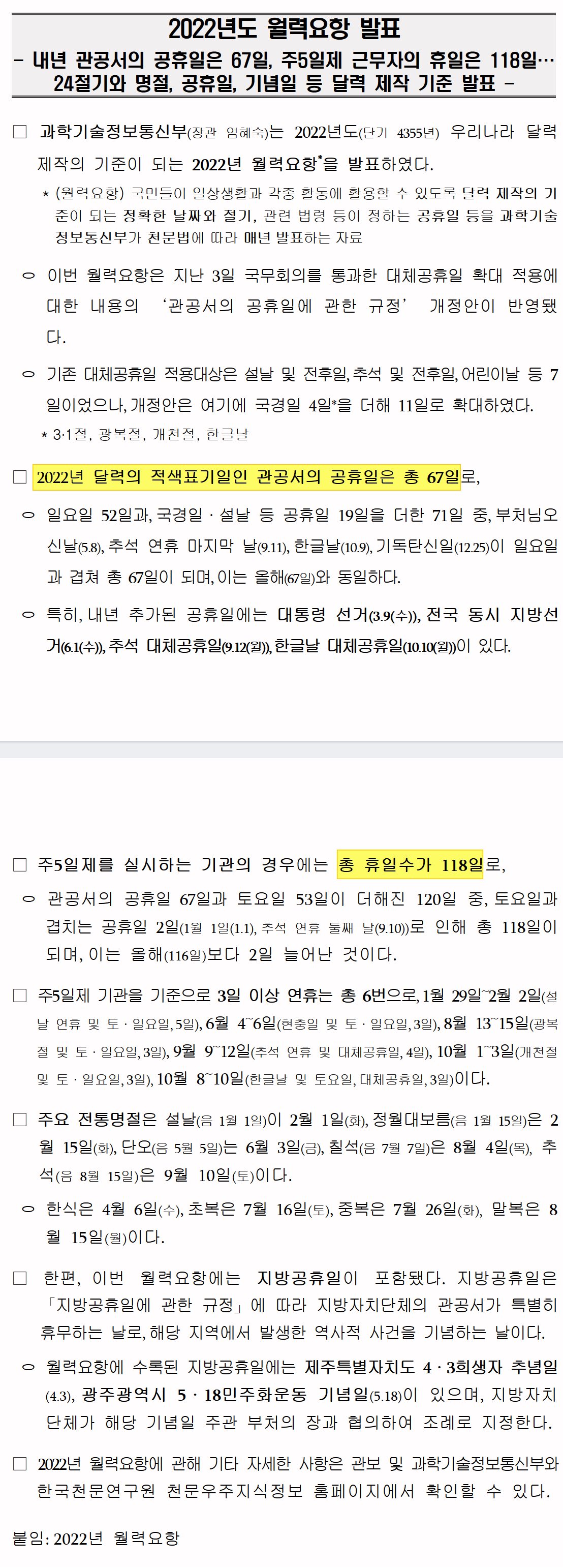 | Subject | 내년 주요 연휴(2022년 월력요항) |