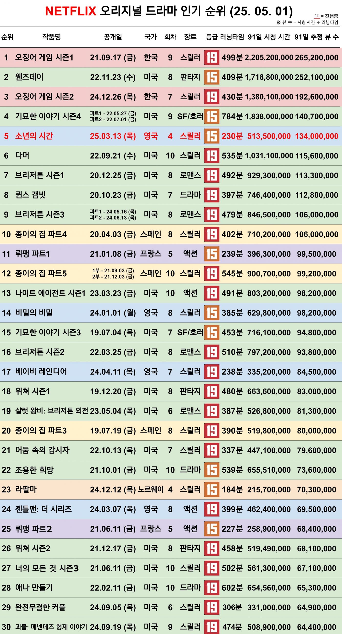 역대 넷플릭스 오리지널 드라마 인기 순위