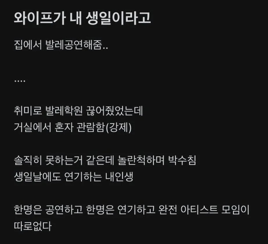 | Subject | 와이프가 생일이라고 발레 공연해줌 |