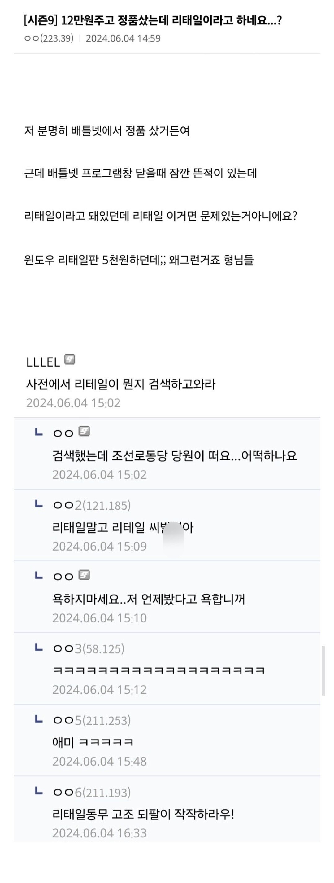 Subject   12만원 주고 정품 샀는데 리태일이라고 하네요?