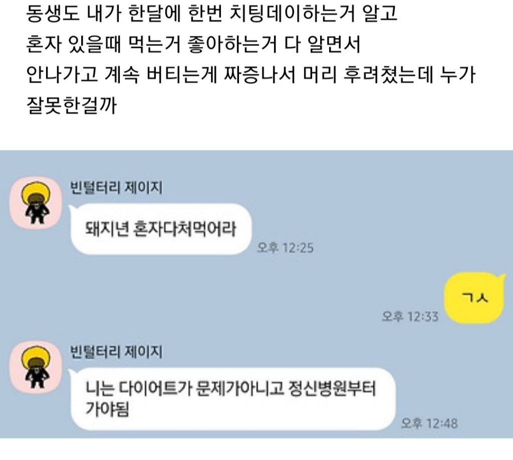 69677 4~5인분이나 해놓고 한 입도 못준다는 언니 잘못이다 vs 치팅데이 알면서 달라고 한 동생 잘못이다 8 swear 25/09/26 1218 0