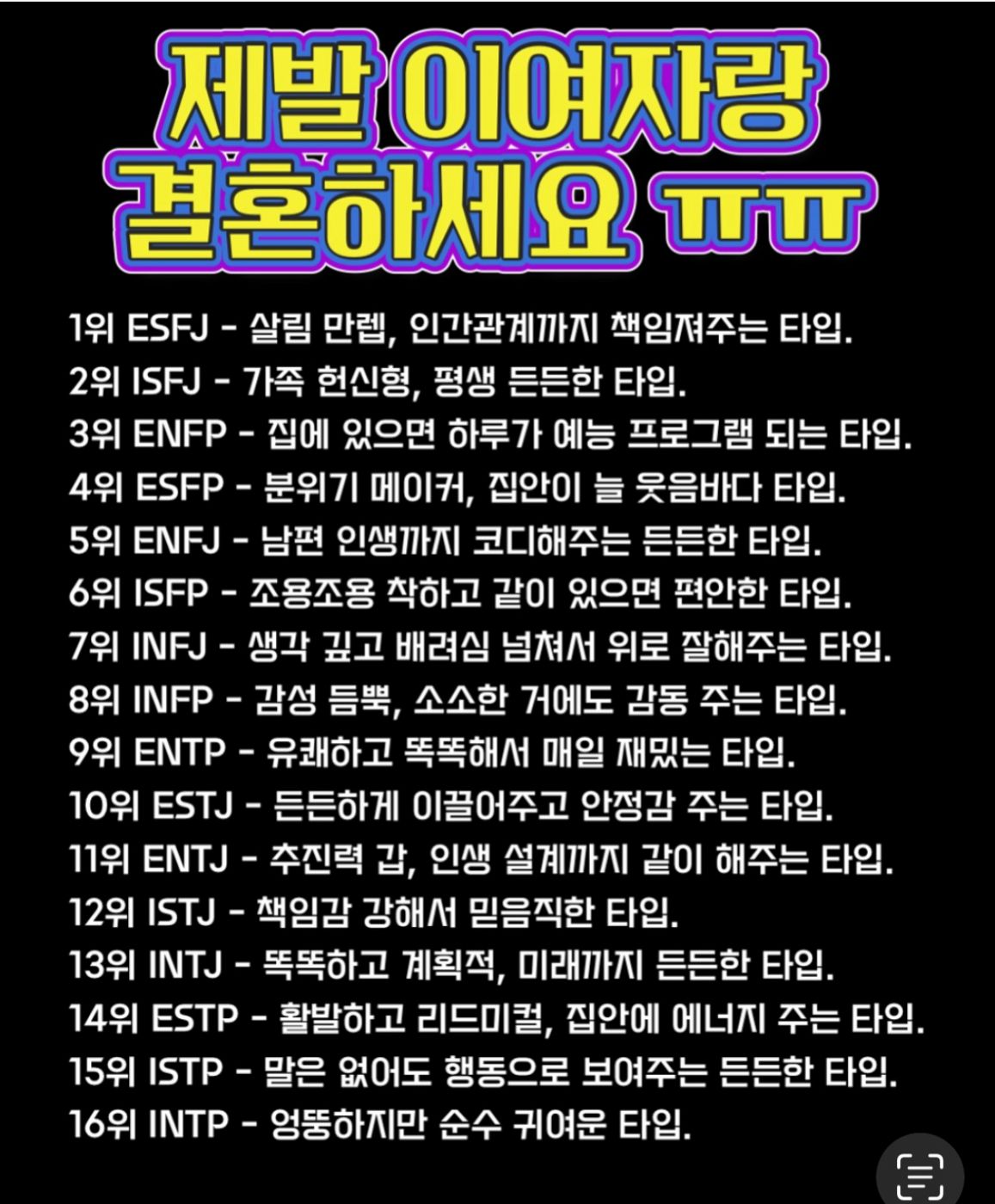 69685 결혼하기 좋은 여자 mbti 16 골든햄스 25/09/27 1979 0