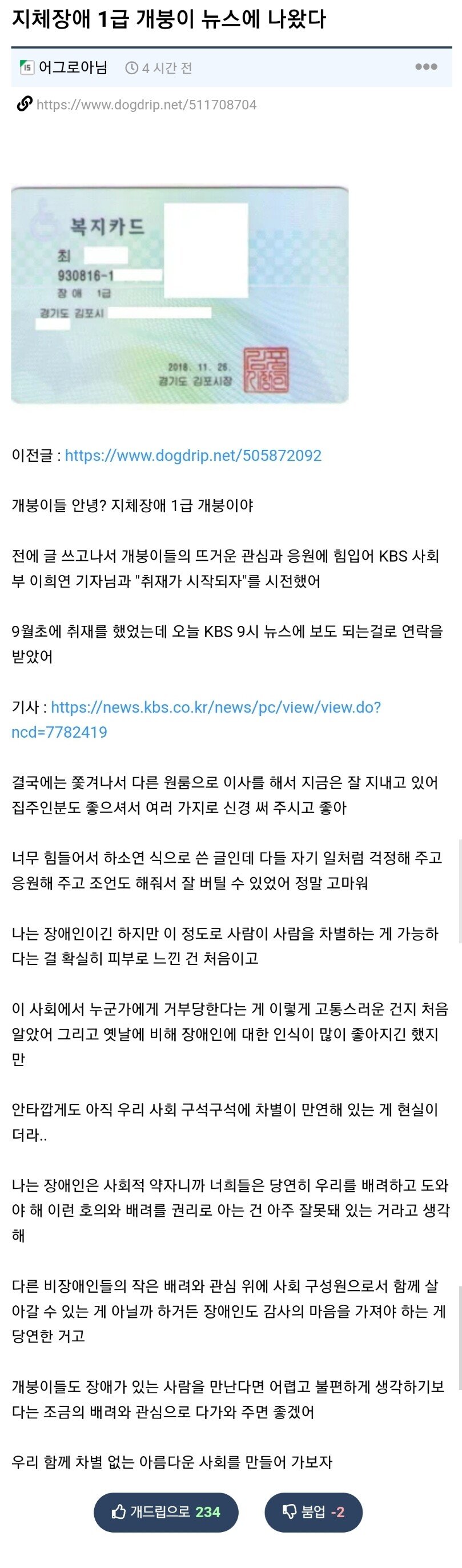 | Subject | 원룸에서 쫓겨난 지체장애 1급 장애인 |