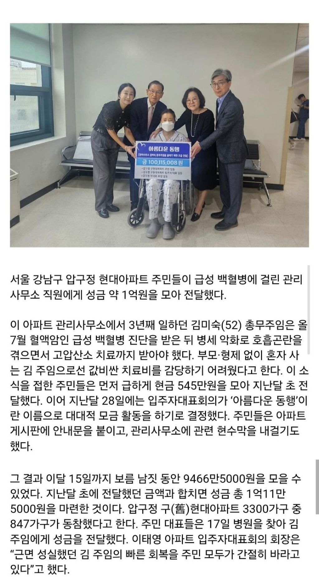 69895 압구정 현대아파트 주민들, 백혈병 관리소 직원에 1억원 전달.jpg 김치찌개 25/10/24 1204 1