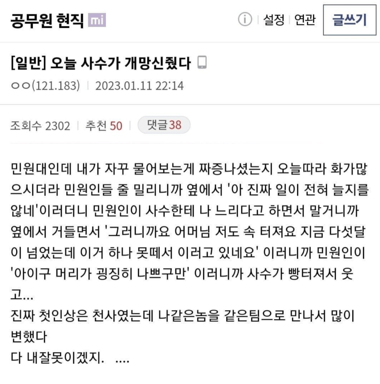 아니 일못하면 짜증날순 있는데 민원인 앞에서 그러는건 좀…따로 불러서 얘길하지.. 0