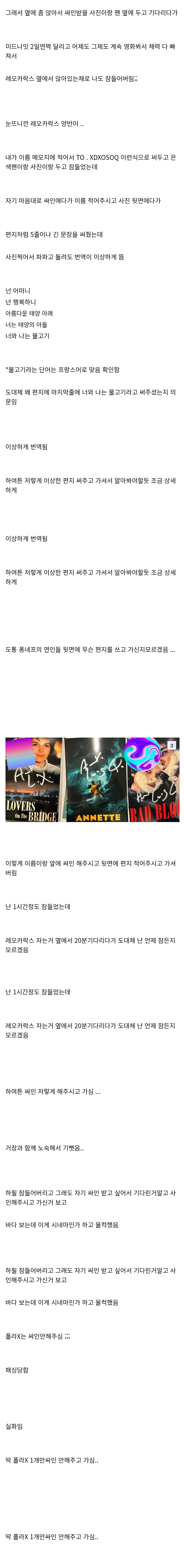 | Subject | 레오 카락스 옆에서 잠들었다가 일어났는데 싸인해주고 감 |