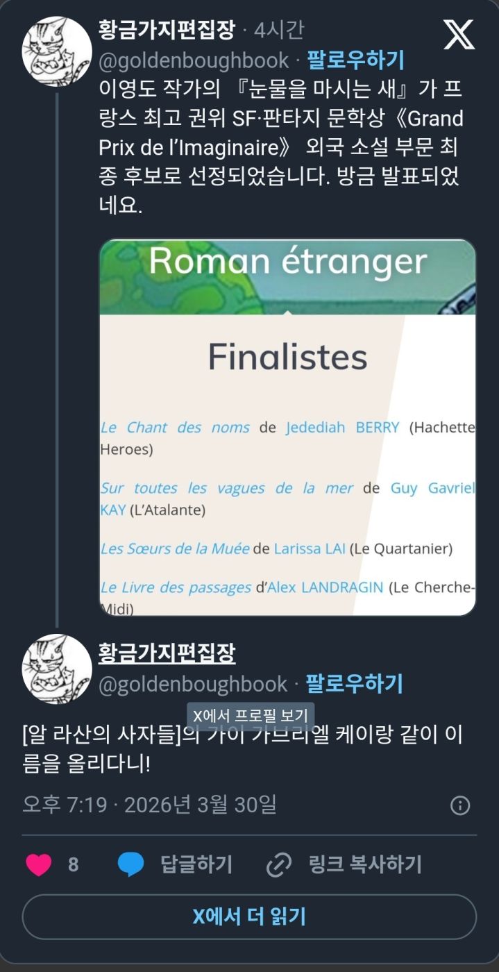 | Subject | 프랑스에서 장르문학상 후보에 오른 눈마새 |