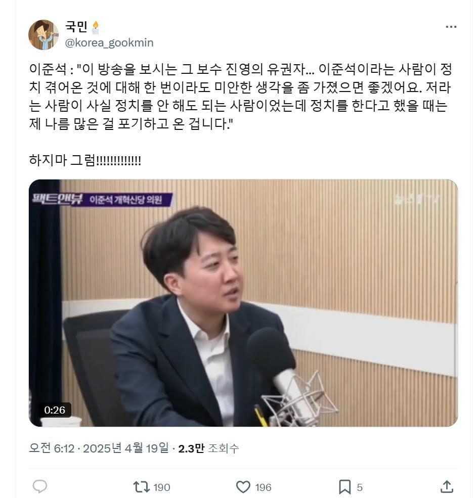 1980 정치[전문] 이준석 "내가 보수 성골, 윤석열·한동훈은 근본이 없다" 23 Picard 25/04/22 3409 0