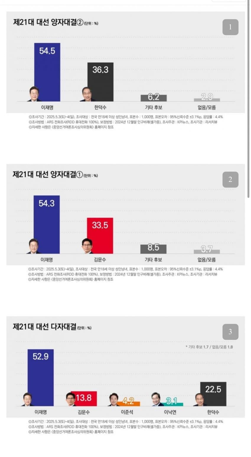 2118 정치이재명 52% 한덕수 18% 김문수 16% (+리서치뷰 주말 여론조사 추가) 5 명동의밤 25/05/05 2902 1