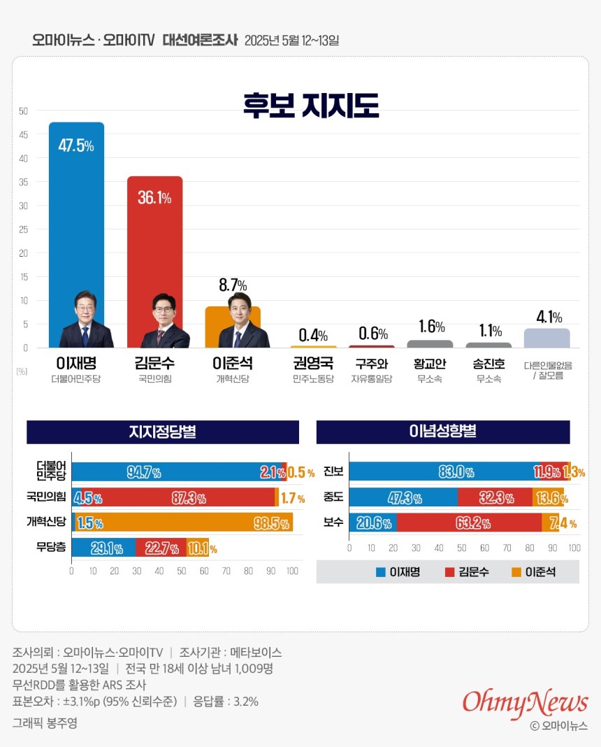 Subject   후보 7명 모두 묻자, 이재명 47.5%-김문수 36.1%-이준석 8.7%