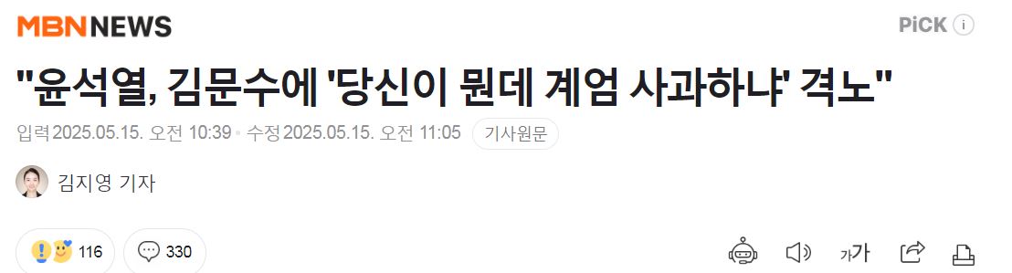 Subject   "윤석열, 김문수에 '당신이 뭔데 계엄 사과하냐' 격노"