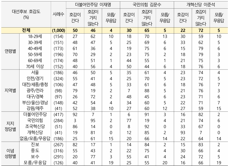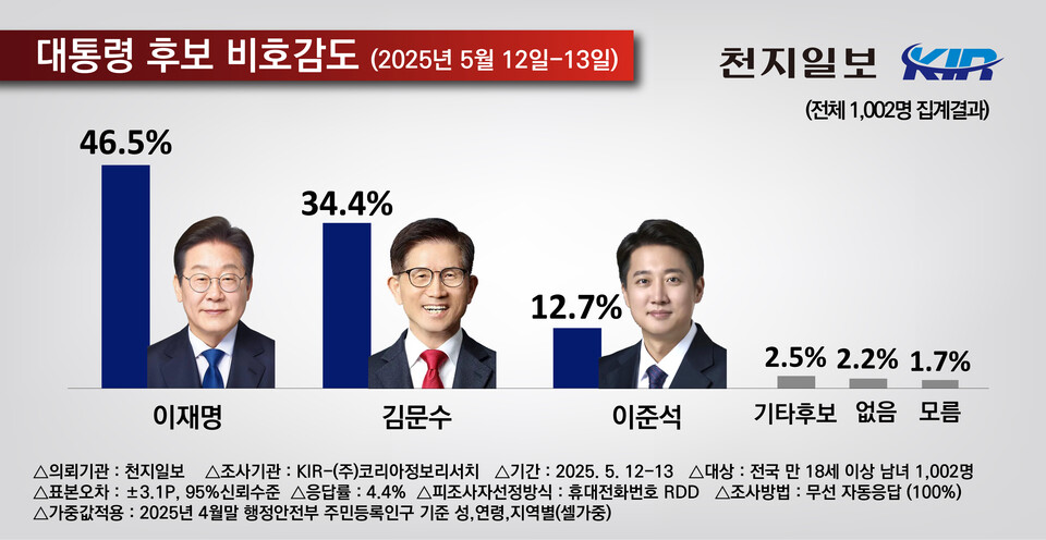 | Subject | ‘대선 후보 비호감도’ 이재명 46.5%로 1위… 김문수·이준석 순 |