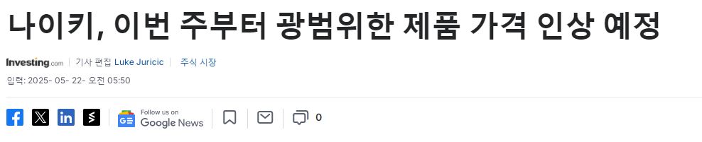 | Subject | 나이키, 이번 주부터 광범위한 제품 가격 인상 예정 |