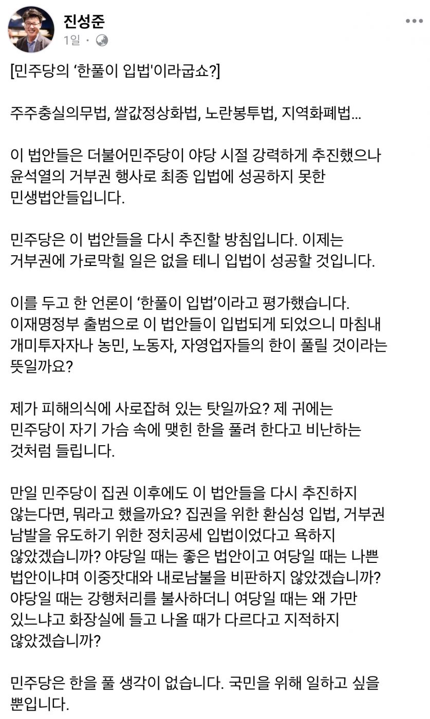지난 정부에서 대통령 거부권에 막힌 ▶상법 ▶노동조합법(노란봉투법) ▶양곡관리법 ▶지역사랑상품권법 ▶방송 3법(방송법·방송문화진흥회법·한국교육방송공사법) 개정안도 12일 본회의 처리를 검토 중이다. 진성준 정책위의장은 7일 페이스북에 “거부권에 가로막힐 일은 없을 테니 입법이 성공할 것”이라고 썼다.