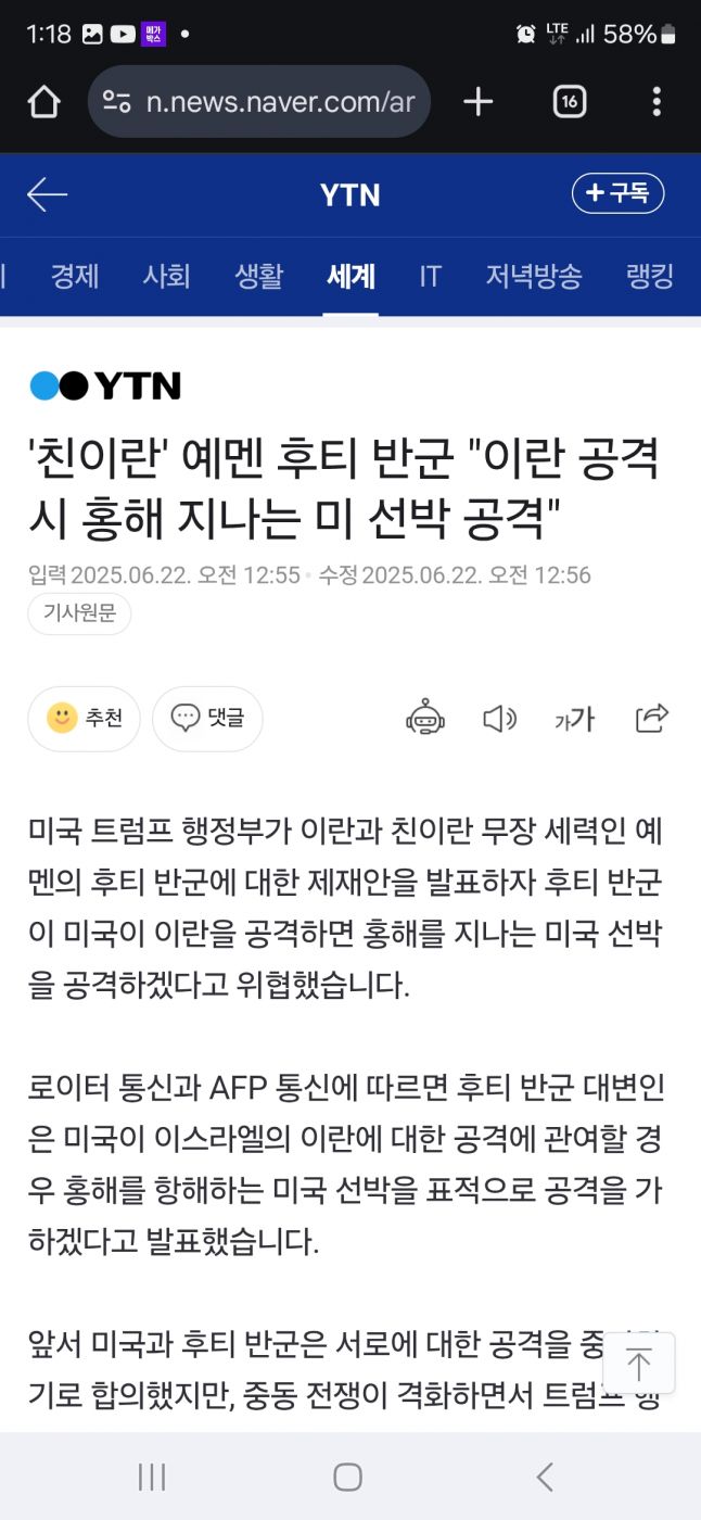 | Subject | 친이란' 예멘 후티 반군 "이란 공격 시 홍해 지나는 미 선박 공격" |