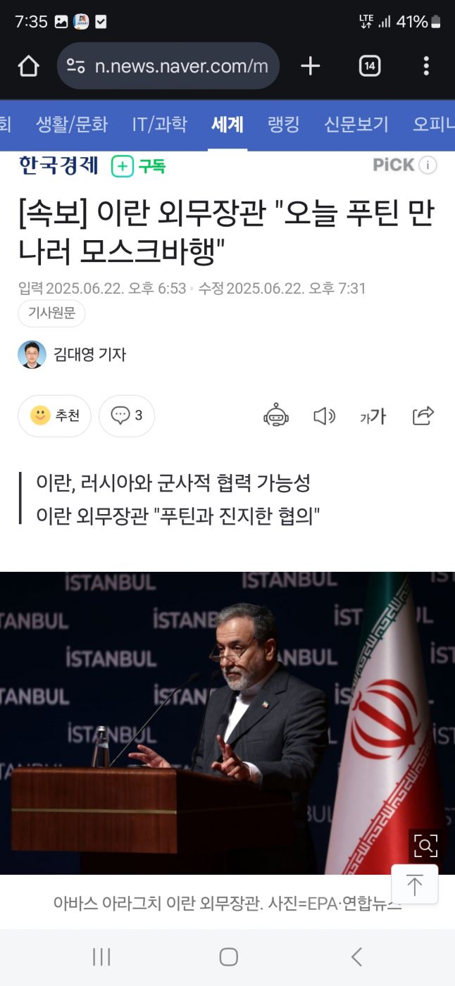 국제속보] 이란 외무장관 "오늘 푸틴 만나러 모스크바행" 6 |
