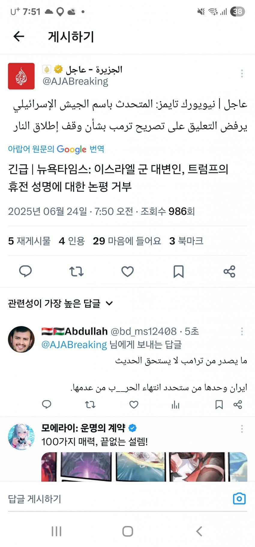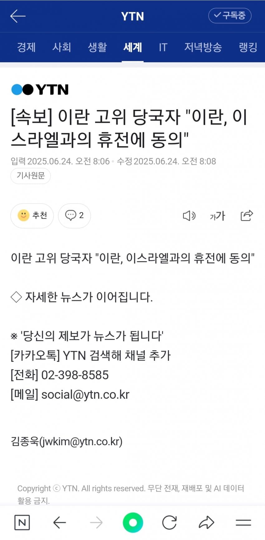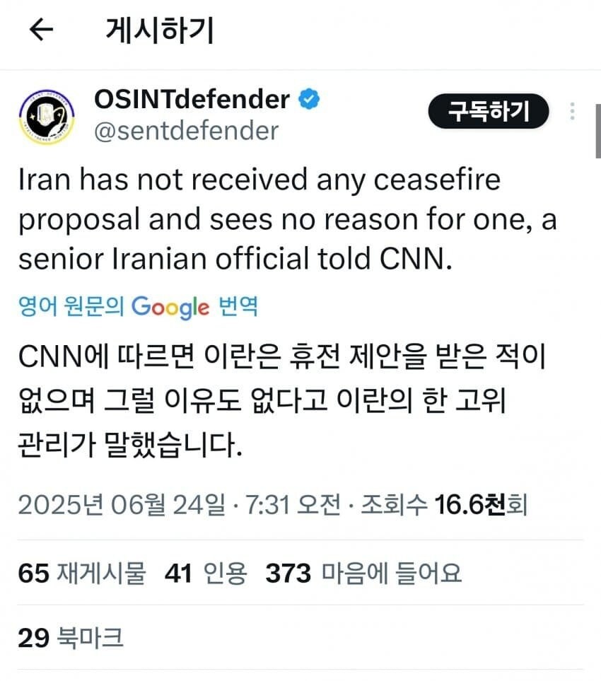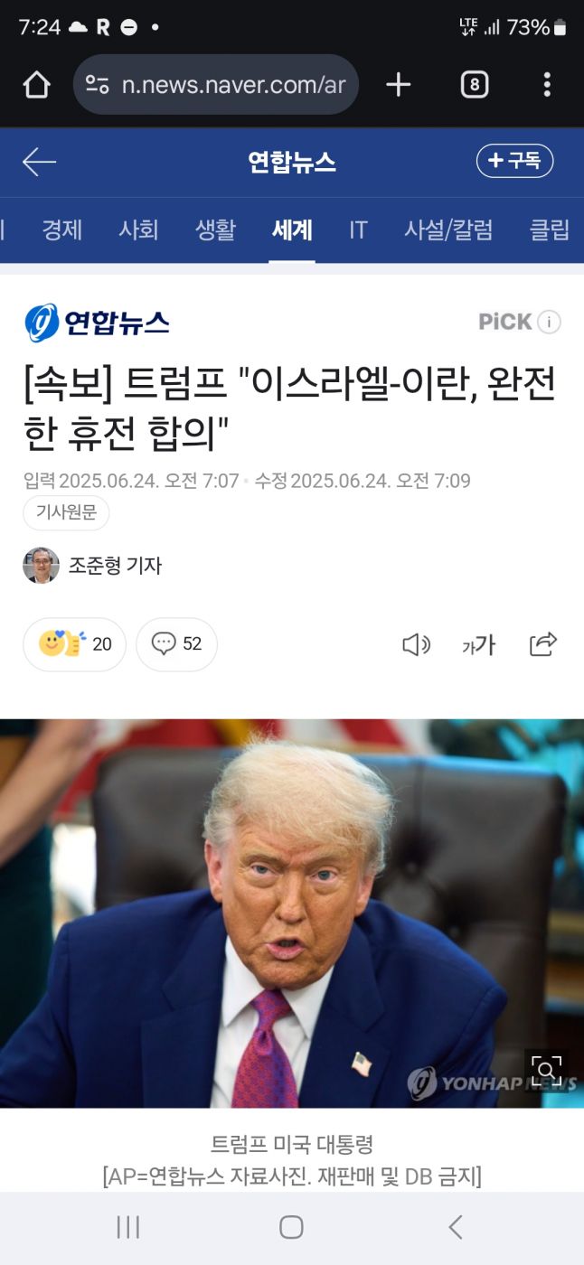 | Subject | 속보] 트럼프 "이스라엘-이란, 완전한 휴전 합의 |