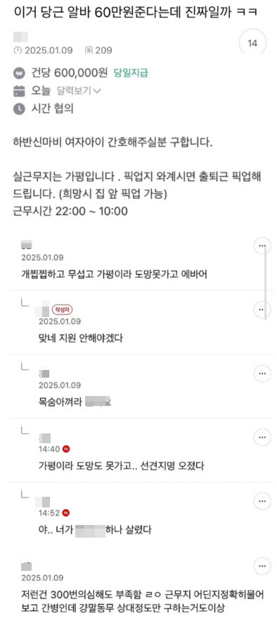 여기에 한 누리꾼이 “진짜일까”라며 호기심을 보이자 다른 누리꾼은 “찝찝하고 무섭다”, “저런 건 300번 의심해도 부족하다. 근무지 어딘지 정확히 물어봐라. 간병인데 말동무 상대 정도만 구하는 것도 이상하다”고 조언하기도 했다.