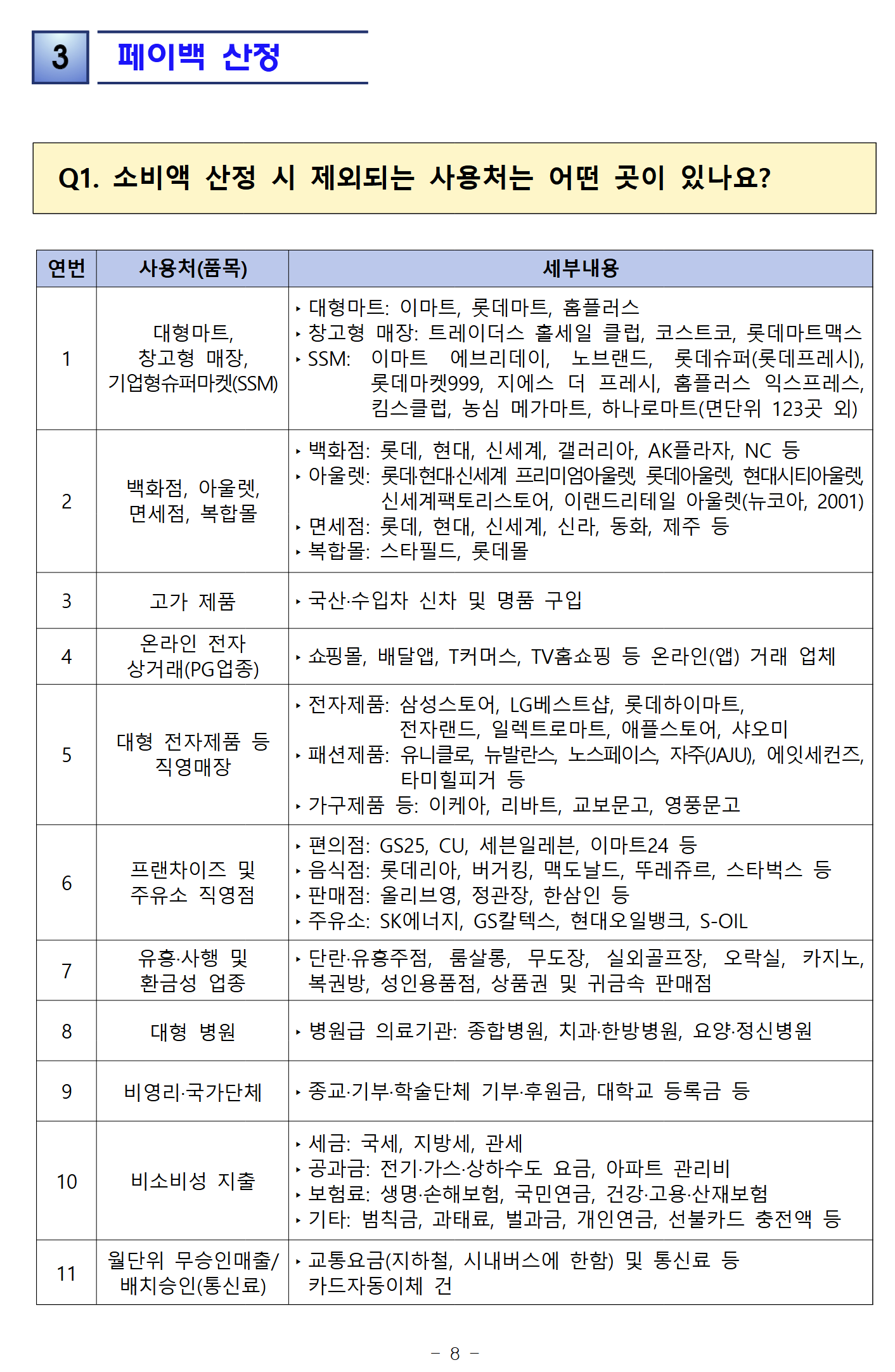 - 소비액 불인정 사용처 : 대형마트, 백화점, 유흥업소, 쇼핑몰/홈쇼핑 등 온라인 거래, 대기업 프랜차이즈 직영점 등