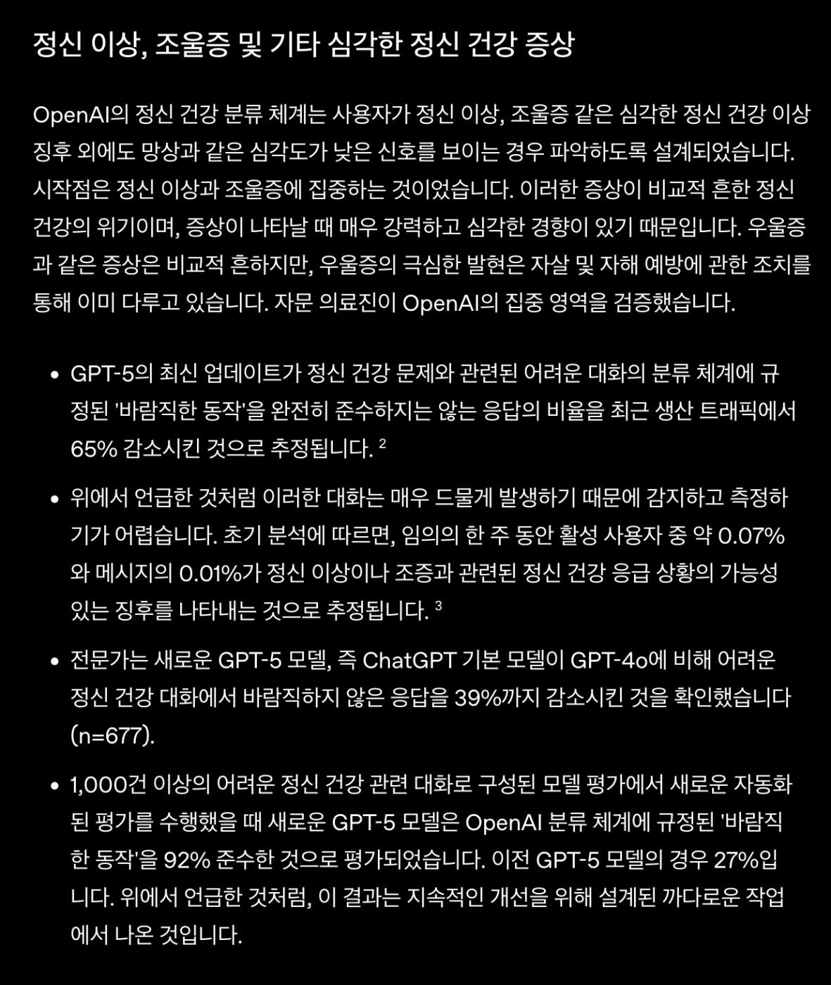 오픈AI 측에서는  임의의 한 주 동안 활성 사용자 중 약 0.07%의 사용자와 메시지의 0.01%가 정신 이상이나 조증과 관련된 정신 건강 응급 상황의 가능성 있는 징후가 있고, 0.15%의 사용자가 잠재적 자살 계획 또는 의도를 나타내는 명시적 지표가 포함된 대화를 하고, 0.05%의 메시지에 명시적 혹은 암시적 지표가 포함된 것으로  추정한다고 했는데, 사용자가 많아져서 이제 주간 활성 사용자가 8억 명에 이르다 보니 그것만 해도 꽤 수가 될 것 같습니다.