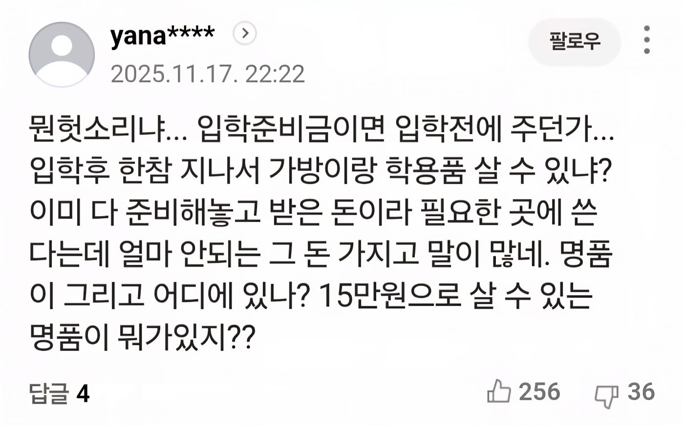 요즘엔 입학준비금이라는 것도 있군요. 우리 어머니는 국민학교 학비를 못내서 선생이 독촉을 했더랬죠. (아니, 이거 제 학교 다닐 적 얘기 아닙니다. 어머니 학창시절 얘기입니다.)