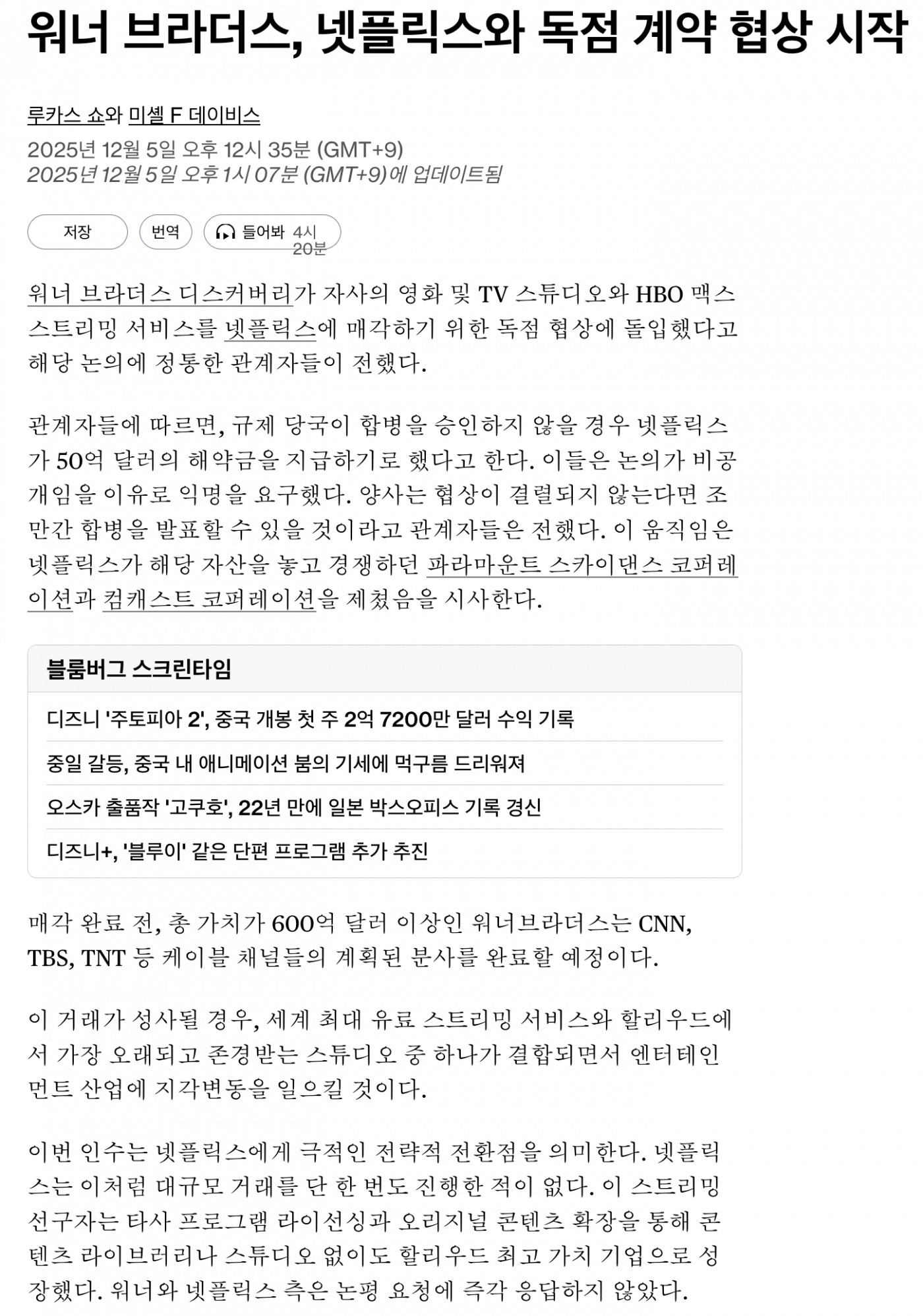 https://www.bloomberg.com/news/articles/2025-12-05/warner-bros-is-said-to-begin-exclusive-deal-talks-with-netflix?accessToken=eyJhbGciOiJIUzI1NiIsInR5cCI6IkpXVCJ9.eyJzb3VyY2UiOiJTdWJzY3JpYmVyR2lmdGVkQXJ0aWNsZSIsImlhdCI6MTc2NDkwNjY0MywiZXhwIjoxNzY1NTExNDQzLCJhcnRpY2xlSWQiOiJUNlJYRDdLR1pBS0gwMCIsImJjb25uZWN0SWQiOiJFNUE4NEE2MjI2QjE0NkRFQjVGN0M2OTY0MERGMEFGNyJ9.6yXyMhzC_YyICVHrbjDxkqsxXFyGRVk6DoMOh0-I6gc&leadSource=uverify%20wall