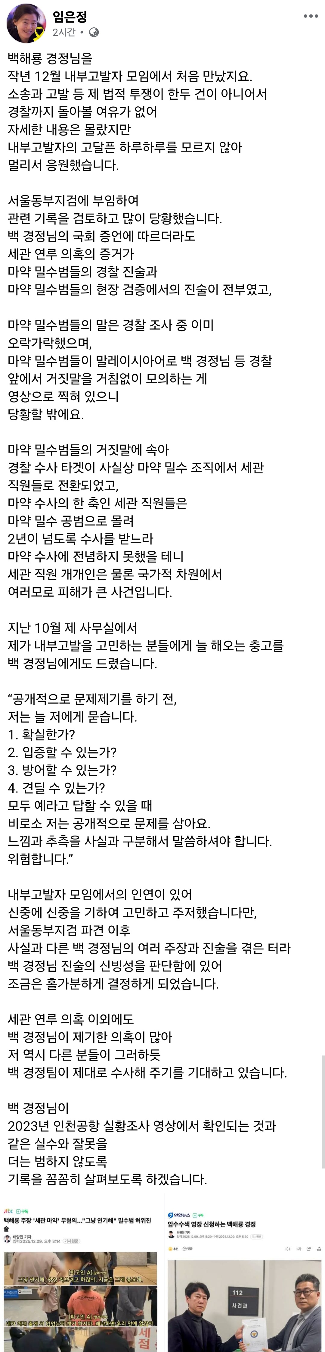 '마약밀수 의혹' 세관 직원들 무혐의…"'수사 외압'도 근거없어"(종합) https://www.yna.co.kr/view/AKR20251209094751004 네.. 이 건은 이제 시마이쳐도 될것 같군요. 세관직원 7명 전원 무혐의. 외압을 행사했다고 의혹이 제기된 경찰공무원 전원 무혐의. 경찰공무원들이나 세관직원들이나 그 누구도 대통령실 관계자와 통화한 사실을 확인하지 못했고 오히려 말레이시아 밀수범들이 말레이시아어로 자기들끼리 대화하면서 경찰 앞에서 허위진술을 지시했던 내용이 녹화된 비디오를 찾아냈다고 하는군요. 백 경정이 문제삼았던 갑작스러운 브리핑 연기와 보도자료 수정 지시 또한 백 경정이 공보규칙상 필요한 서울청 수사부장과 경찰청 국수본 마약계에 사전보고를 하지 않았으며 세관을 압수수색하기 수 시간 전 보도자료 배포와 언론 브리핑을 단행해 수사기밀 유출 우려가 있었기에 경찰 공보규칙에 따른 적법한 업무 지시로 판단했다고 합니다. 그러니까 그냥 마약 밀수범들이 마약을 밀수하다 걸린거지 세관직원이랑 내통을했다거나 하는거랑은 별 상관 없었다... 이런 얘깁니다. 0
