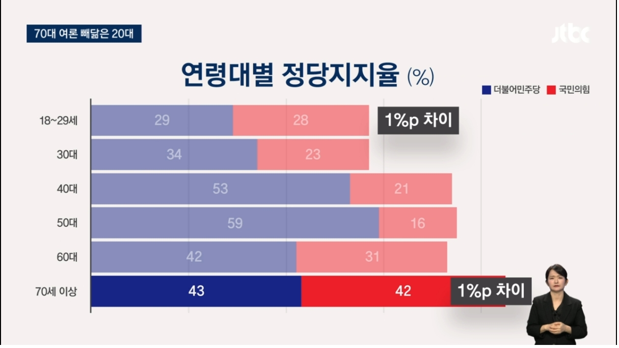 대충 보면 오히려 70대보다도 반 이재명/더민주, 친 윤석열/국힘 성향이 강하게 잡히고 있네요.