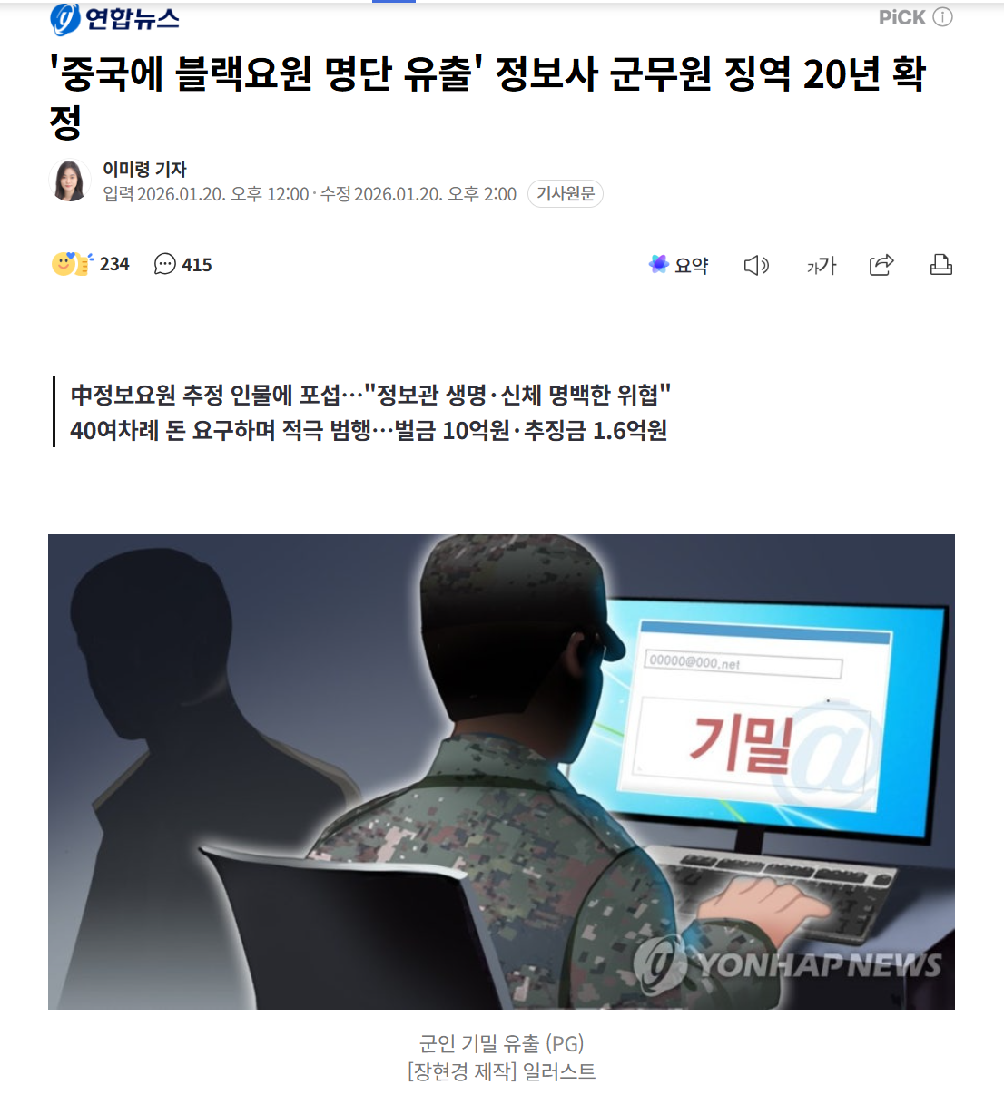 | Subject | '중국에 블랙요원 명단 유출' 정보사 군무원 징역 20년 확정 |