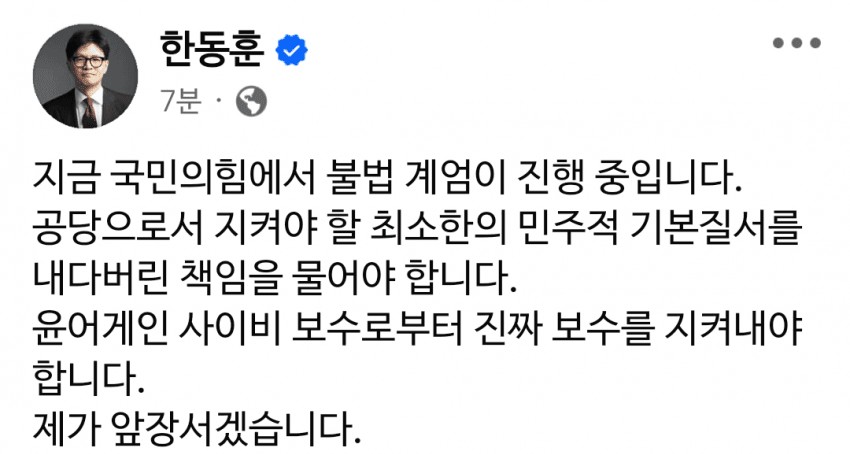 | Subject | 한동훈 "지금 국힘서 불법 계엄 진행 중"…김종혁 탈당 권유에 |