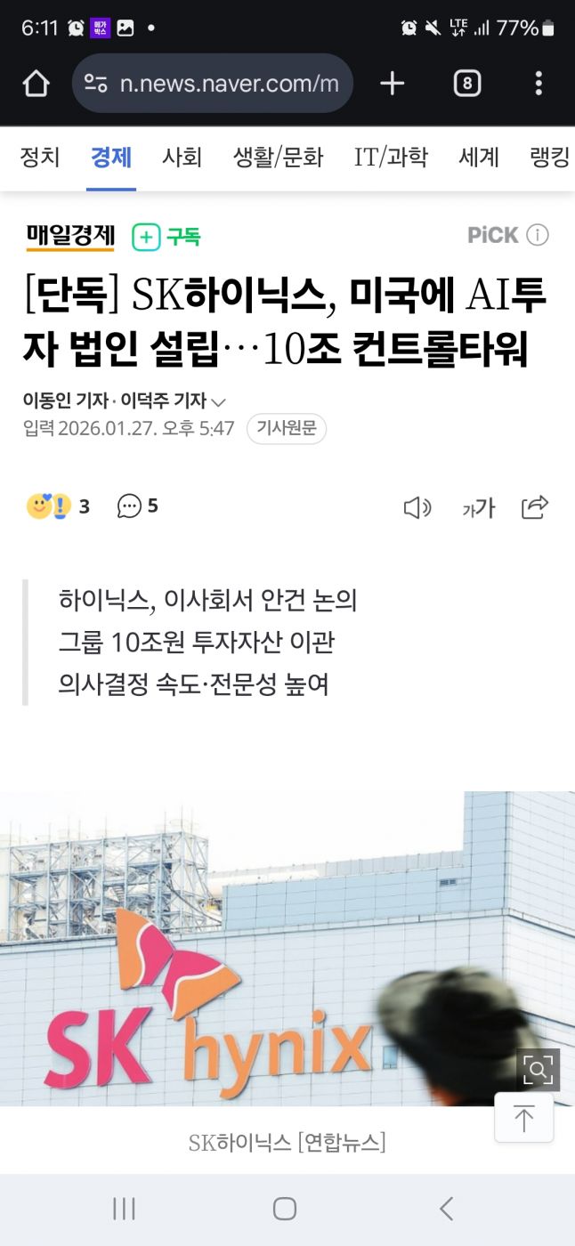 Subject   단독] SK하이닉스, 미국에 AI투자 법인 설립…10조 컨트롤타워